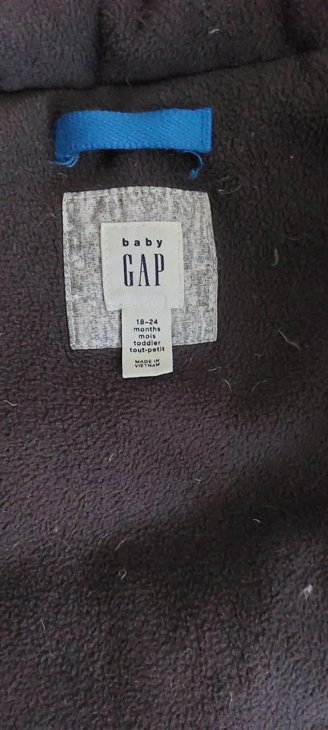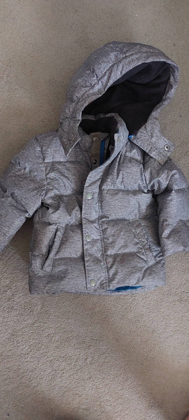 Grey baby Gap puffer jacket. Size 18-24 months. Features a removable hood and zipper closure. Great for colder weather.