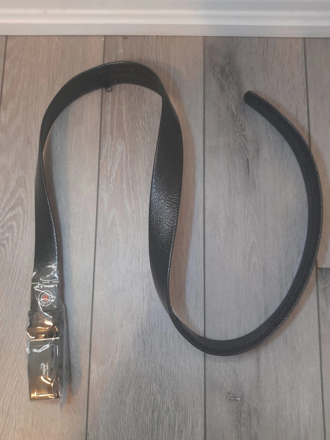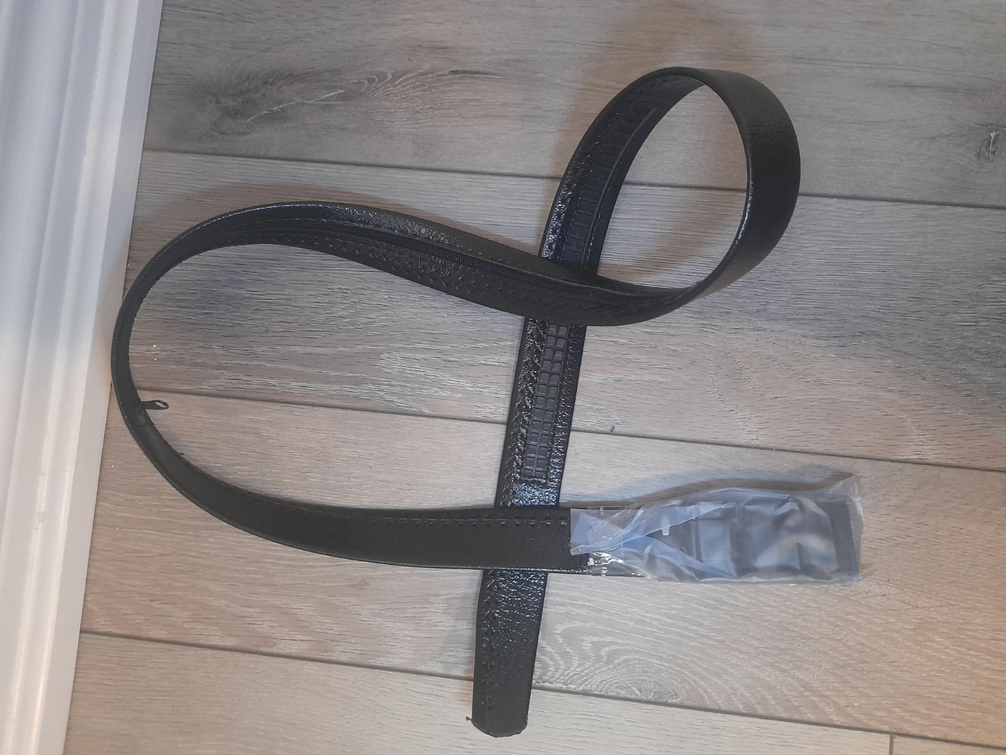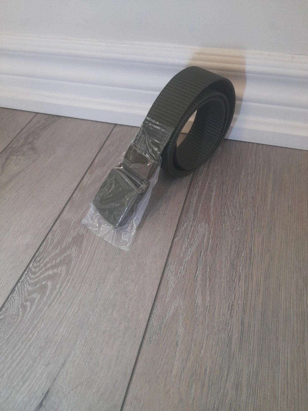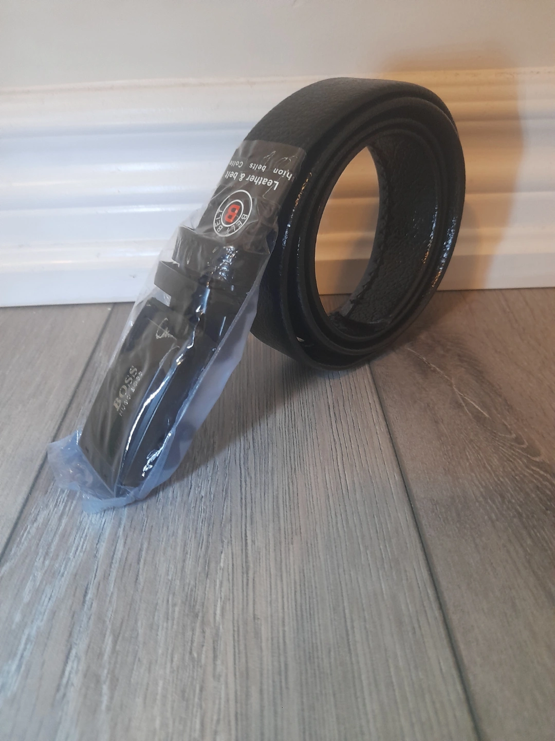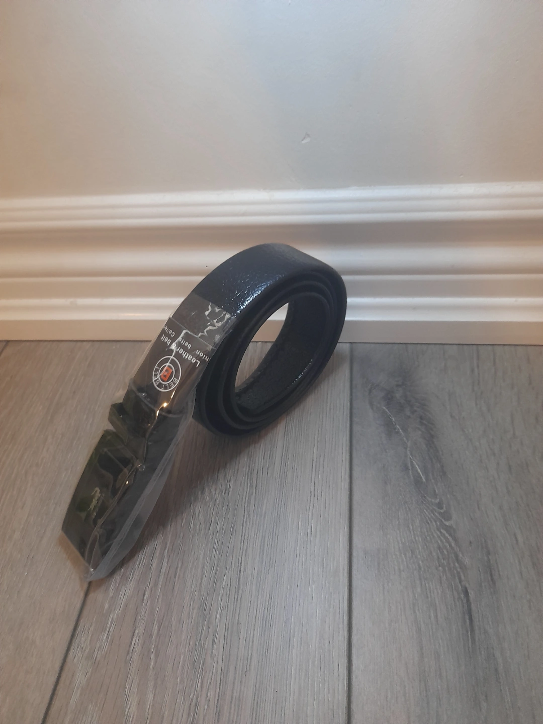 Brand new men's leather belt. Black/green. Automatic buckle. Looks stylish. Black is fake leather and the other one is cloth