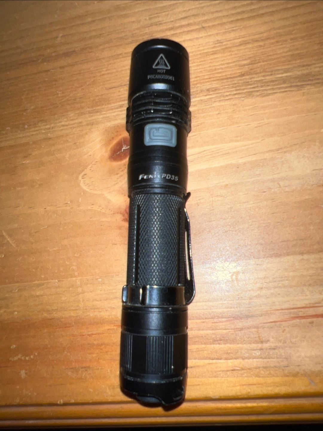 Used Fenix PD35 flashlight. Compact and durable design. Features a single button operation. Shows some signs of wear. Police flashlight with extra features on lights and comes with extra batteries. https://www.flashlightworld.ca/products/fenix-pd36r-pro-heavy-duty-rechargeable-tactical-flashlight