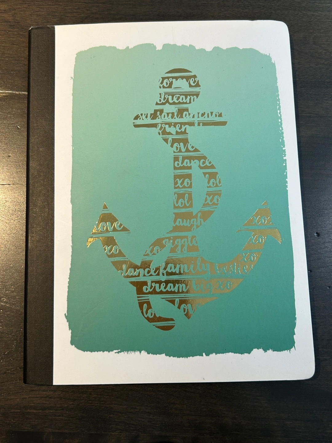 New notebook. Features a teal and gold anchor design. College-ruled paper.