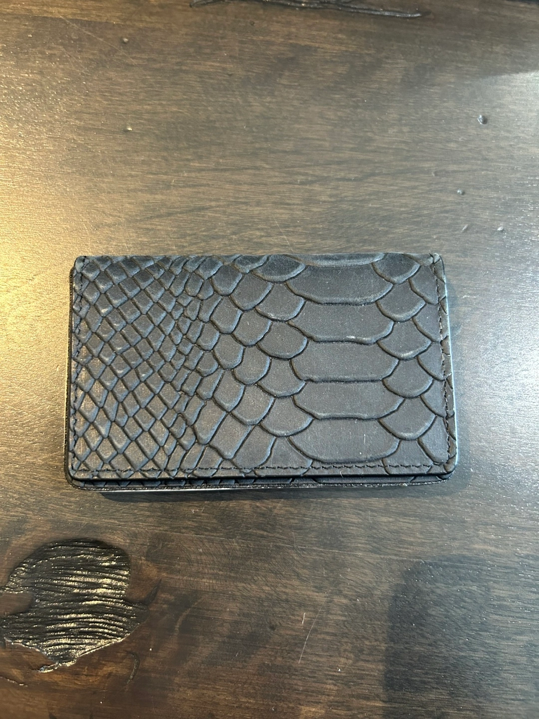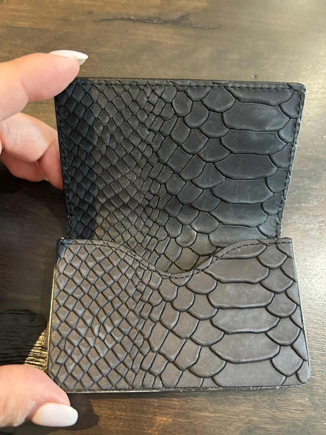 Compact cardholder. Black snakeskin pattern. Minimalist design. Perfect for everyday use. Magnetic closure.