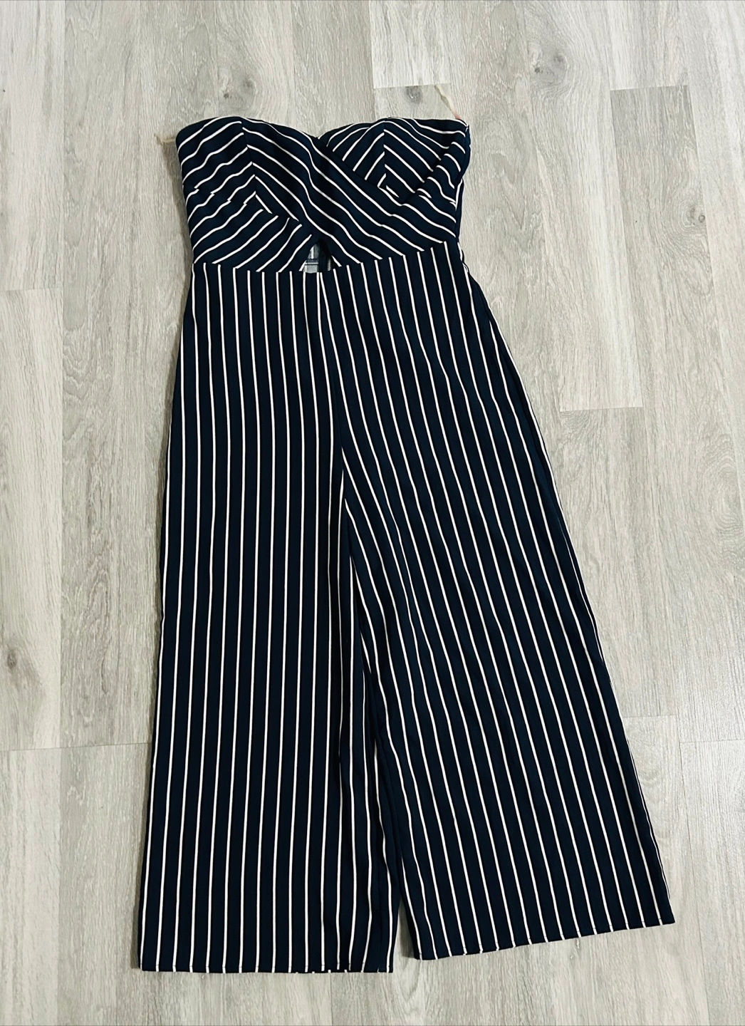 Cute navy and white striped jumpsuit. Strapless design, wide legs. Keyhole detail at the bust. Zipper closure. Perfect for a summer event.