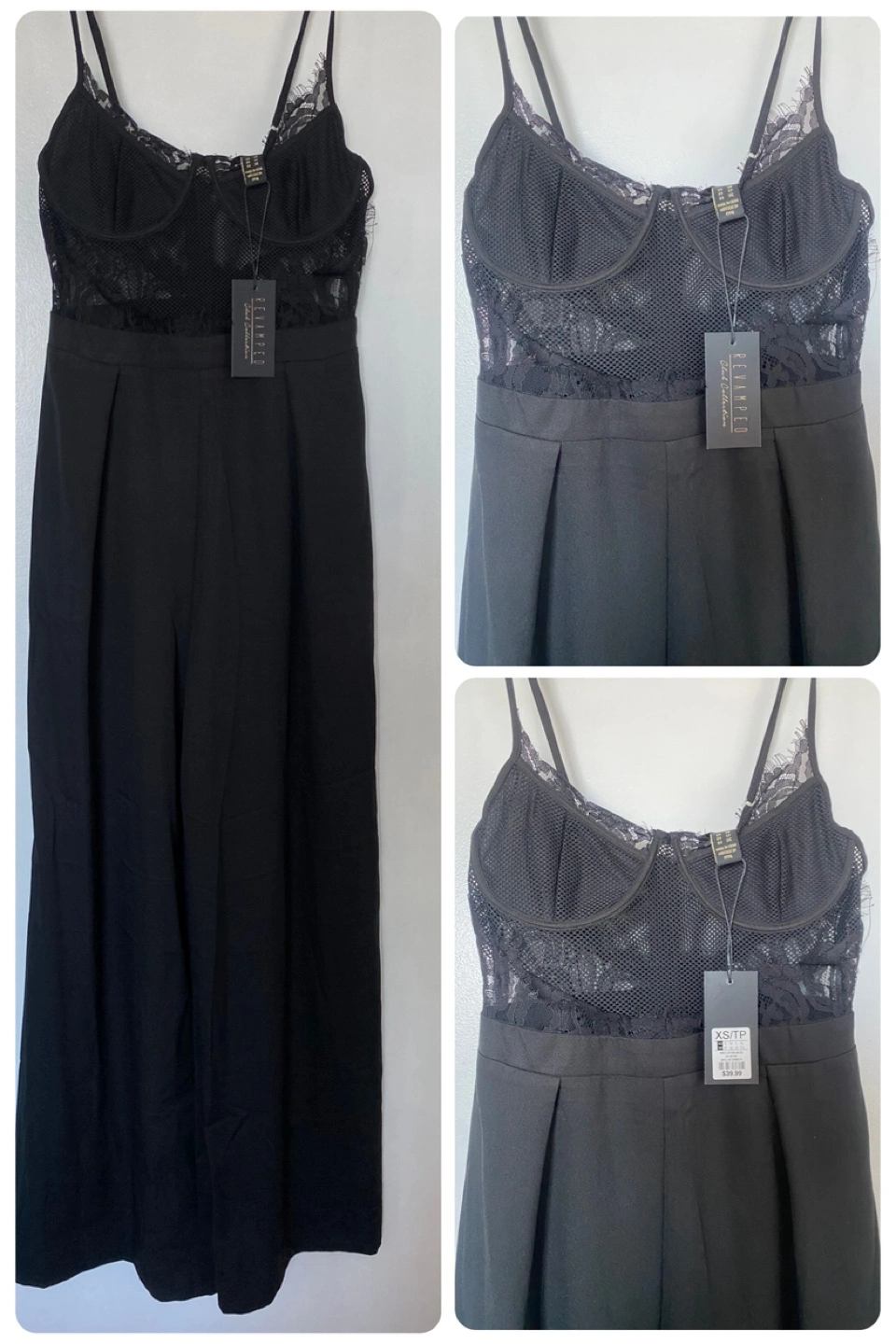Wide-leg jumpsuit. Black lace bodice. Spaghetti straps. Pleated trousers. Brand new with tags. Retail 40.00 plus tax