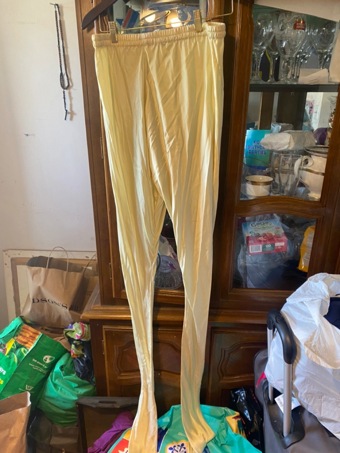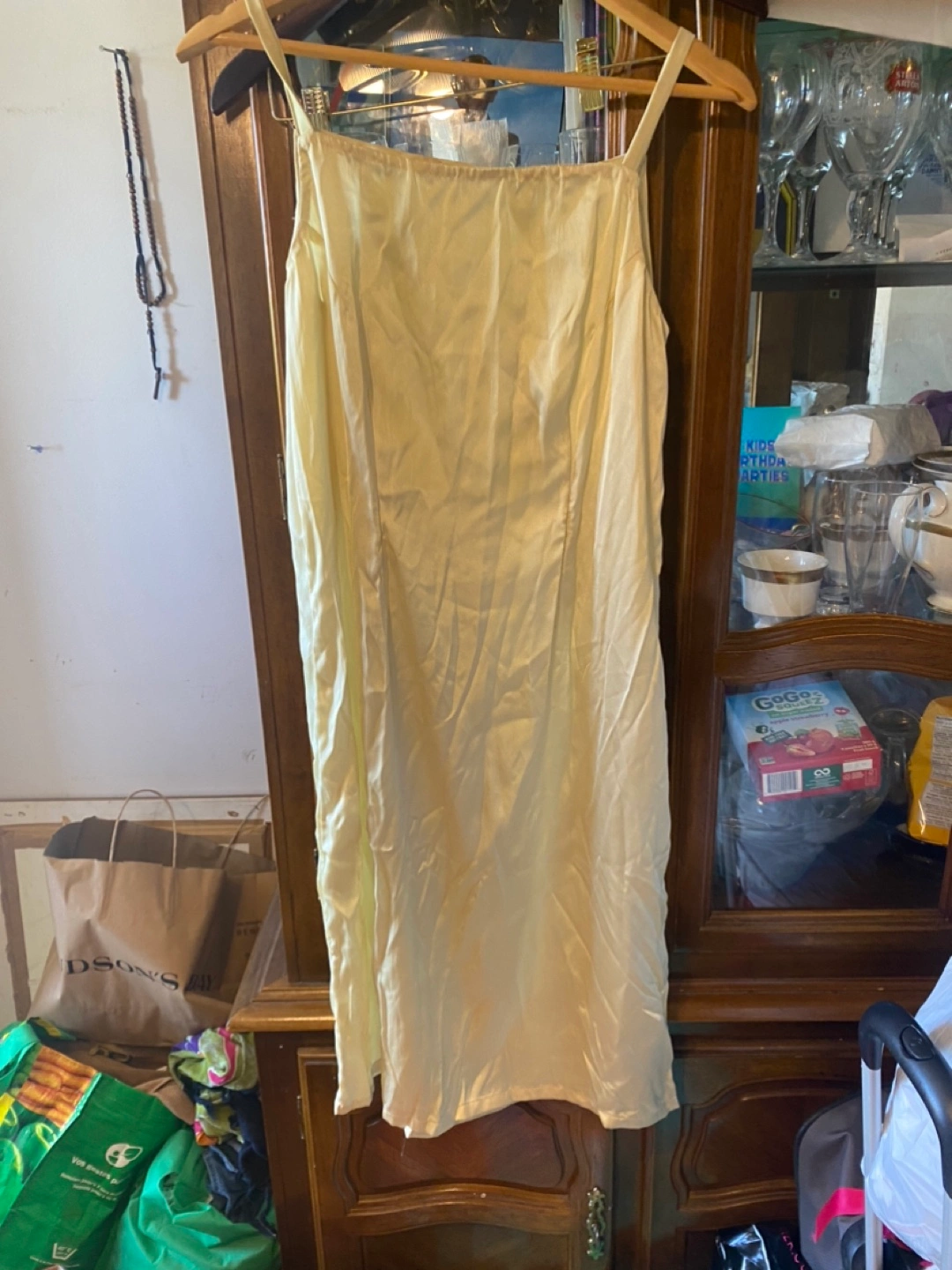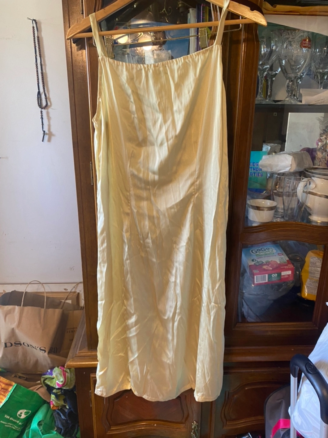 Lightweight, pale yellow slip dress. Features thin shoulder straps and a midi length. Simple, elegant design. Perfect for layering or wearing alone. No size Very good condition Cash only