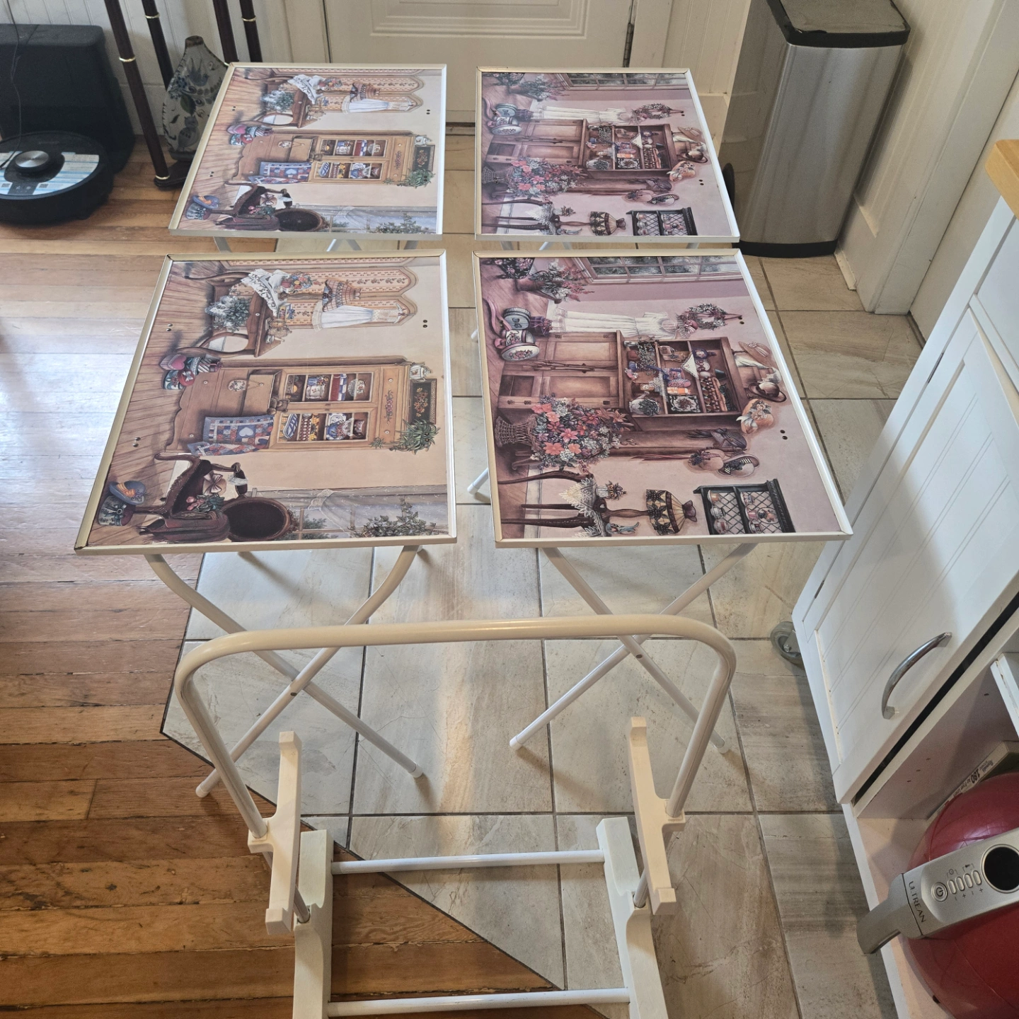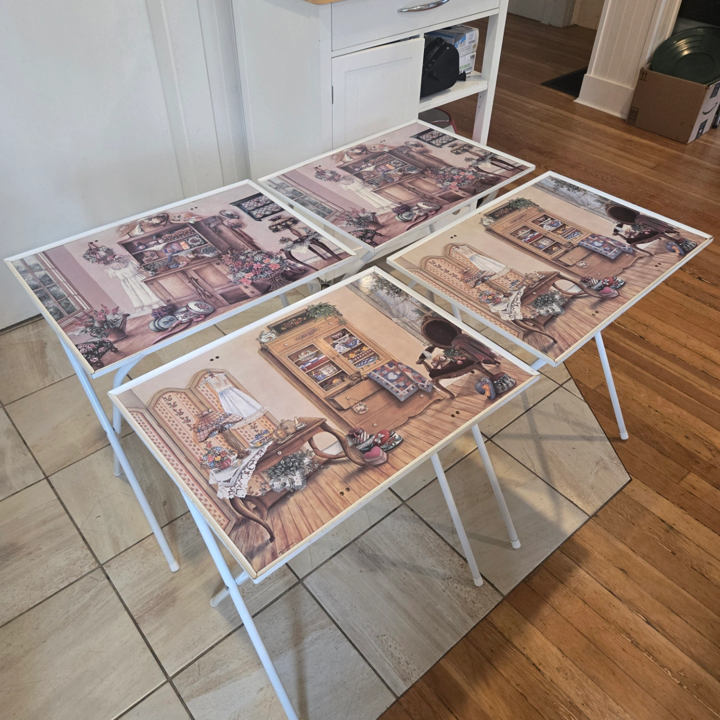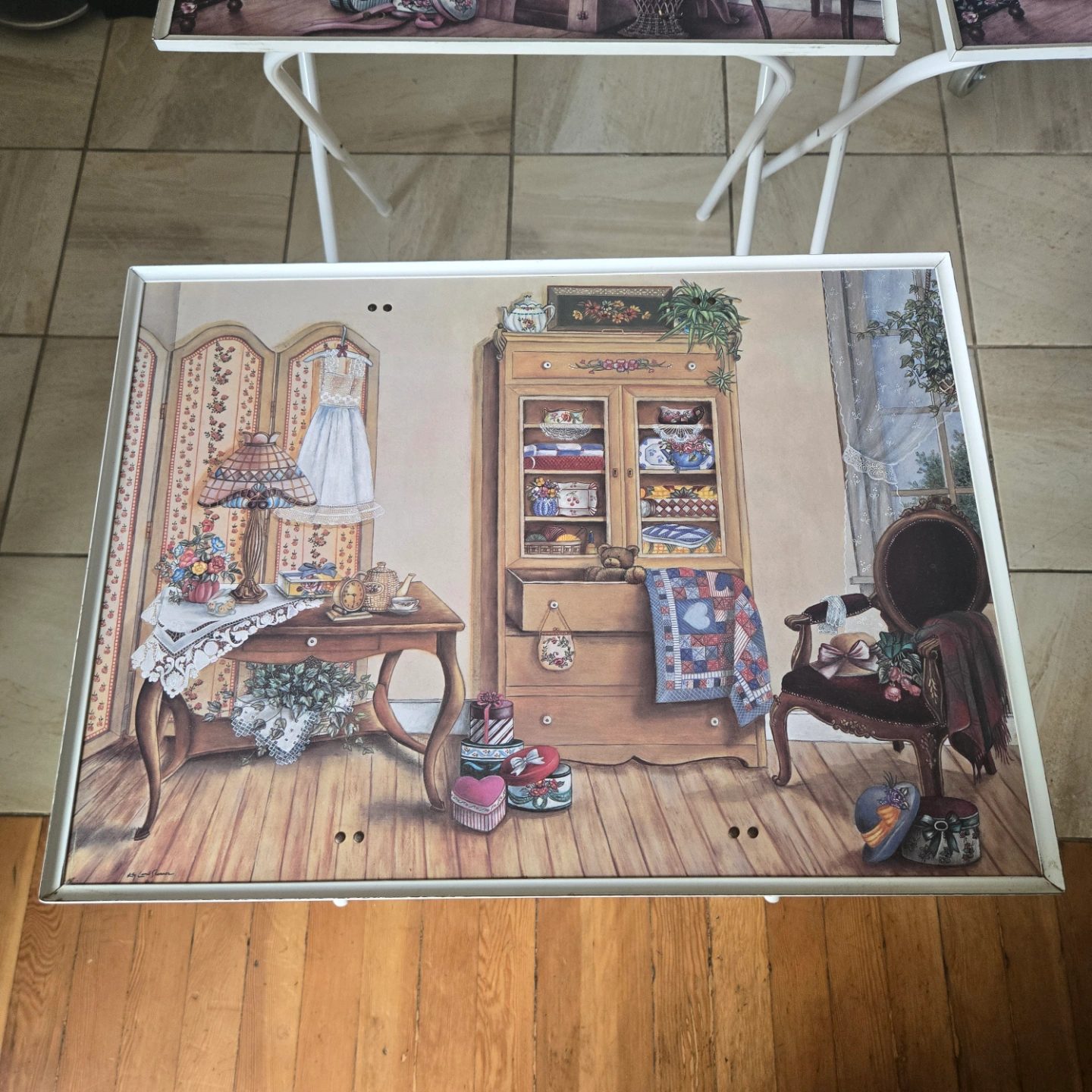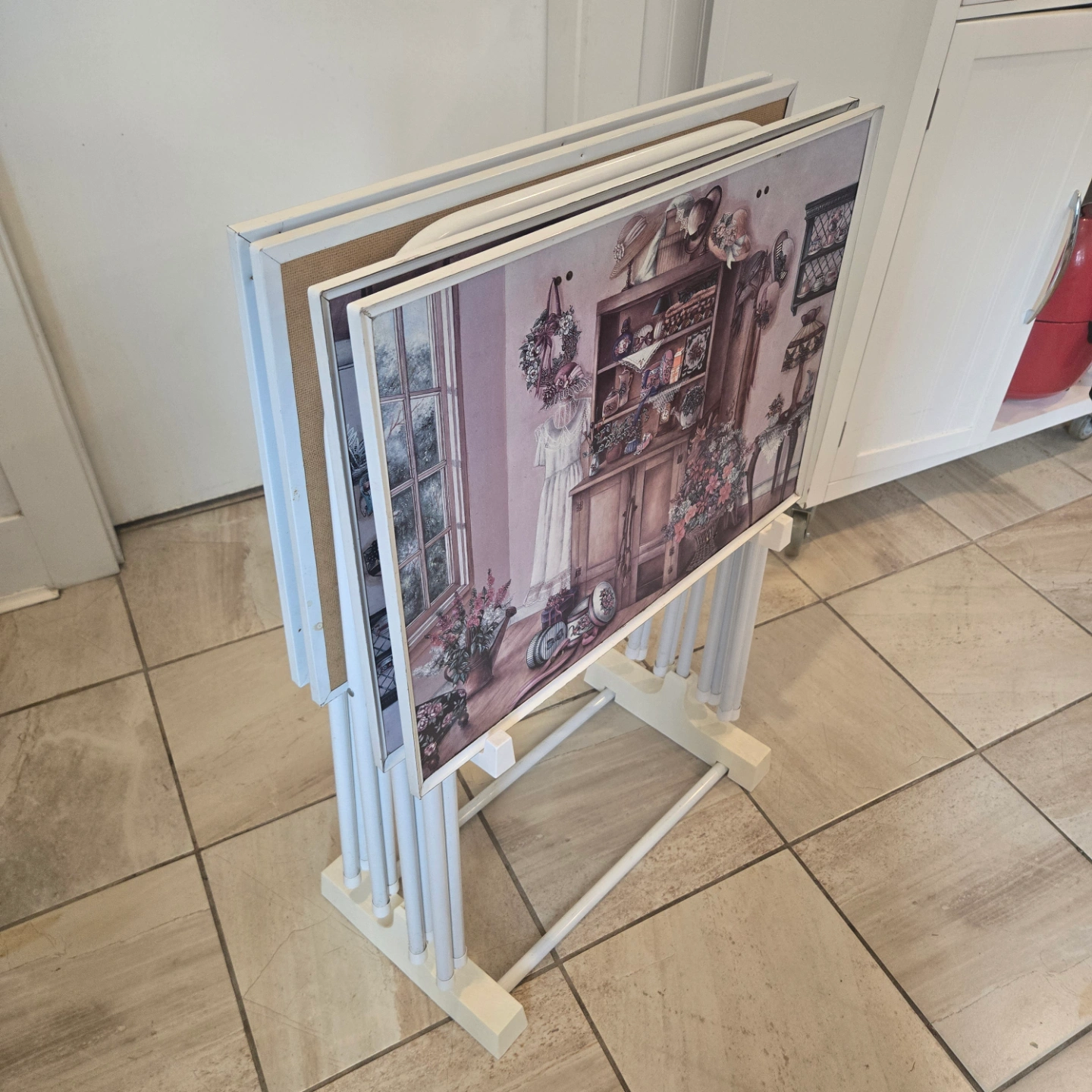 Vintage Kay Lamb Shannon beautiful feminine Art Deco Scenes 4 TV Trays/Stand, White metal frame. Great condition.
