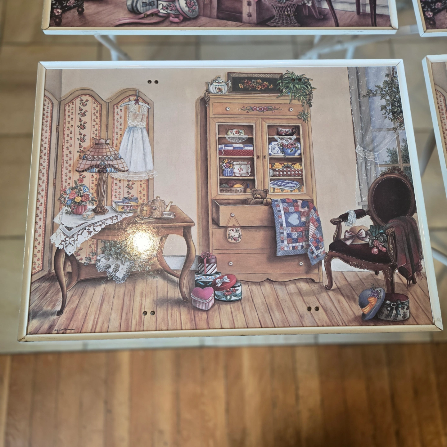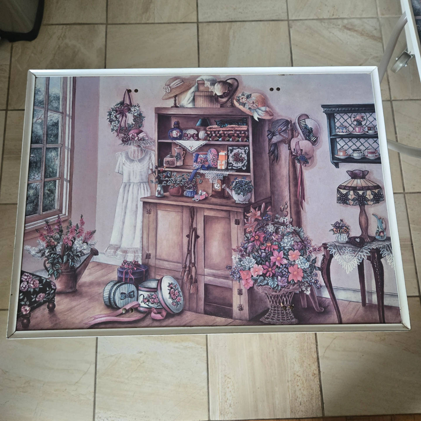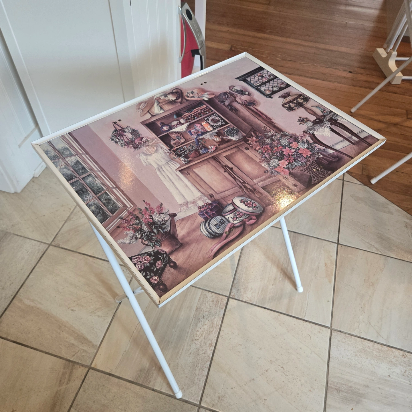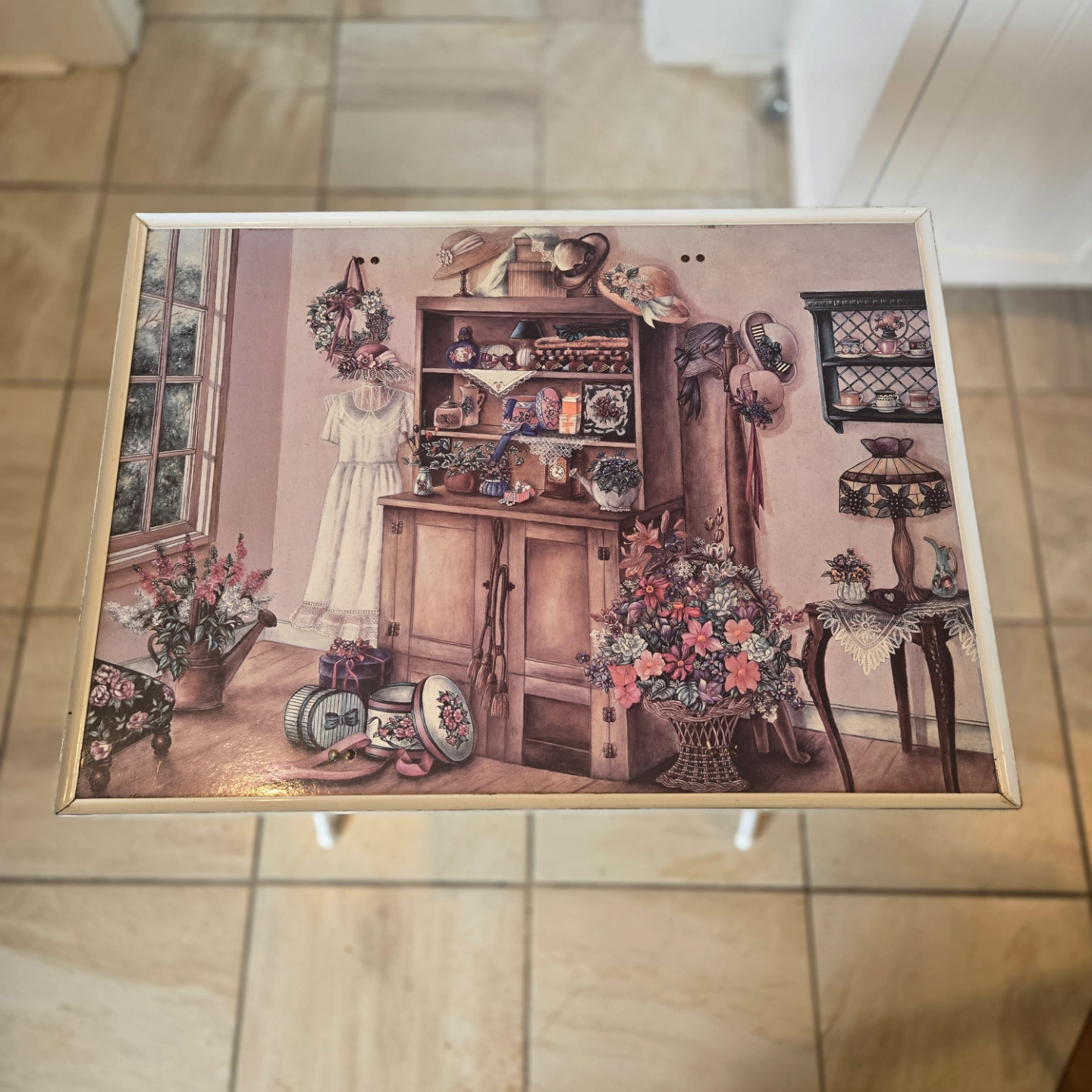 Vintage Kay Lamb Shannon beautiful feminine Art Deco Scenes 4 TV Trays/Stand, White metal frame. Great condition.