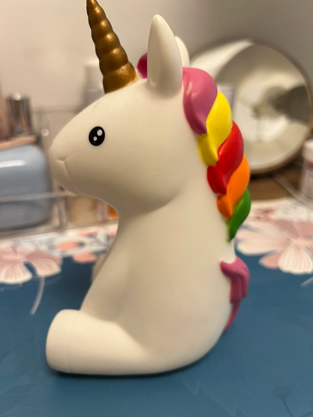 Cute sitting unicorn night light. Changes into multiple colors throughout the night. Battery-operated. Hardly used. Perfect for a child's bedroom.