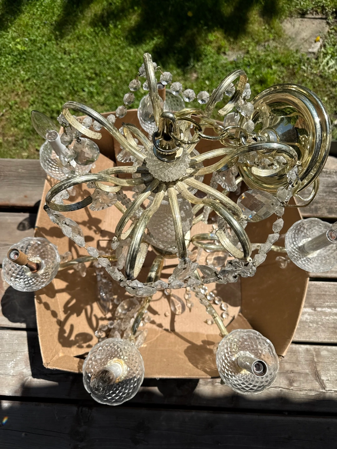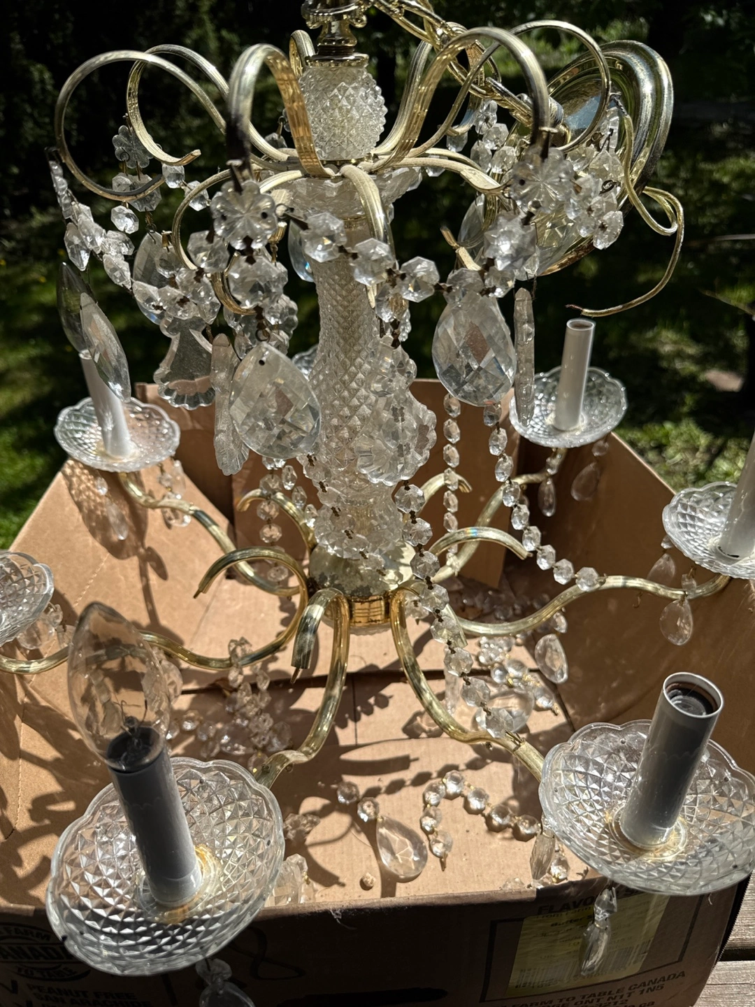 Elegant crystal chandelier. Eight lights. Gold-tone metal frame. Clear crystal accents. Pre-owned. Some crystals may be missing. Cash only Pick location is Yonge and Steeles!