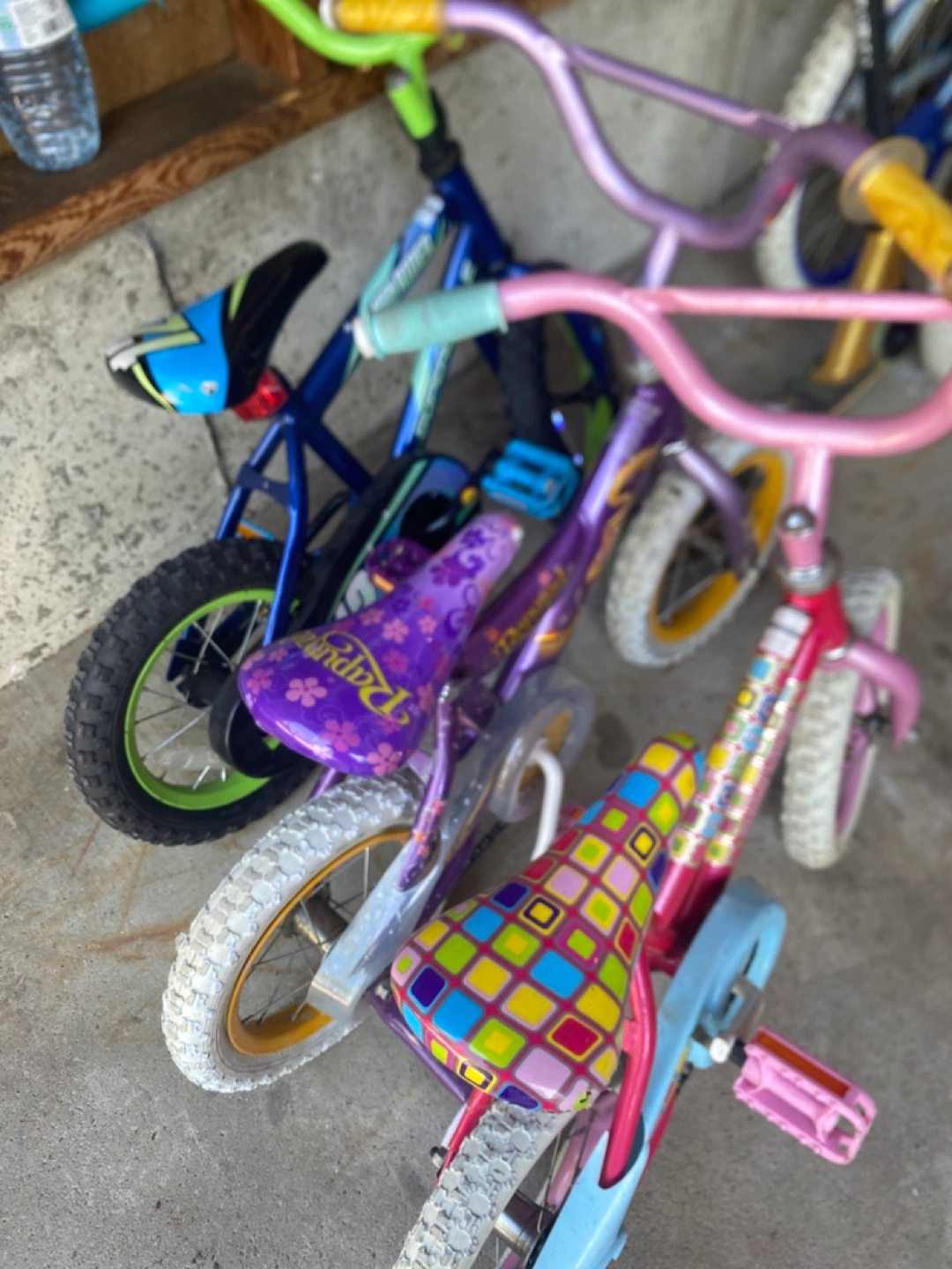 Three girls' bikes. Purple bike has flowers on the seat. Pink bike has colourful geometric seat. Blue bike has a blue seat. Great for kids.