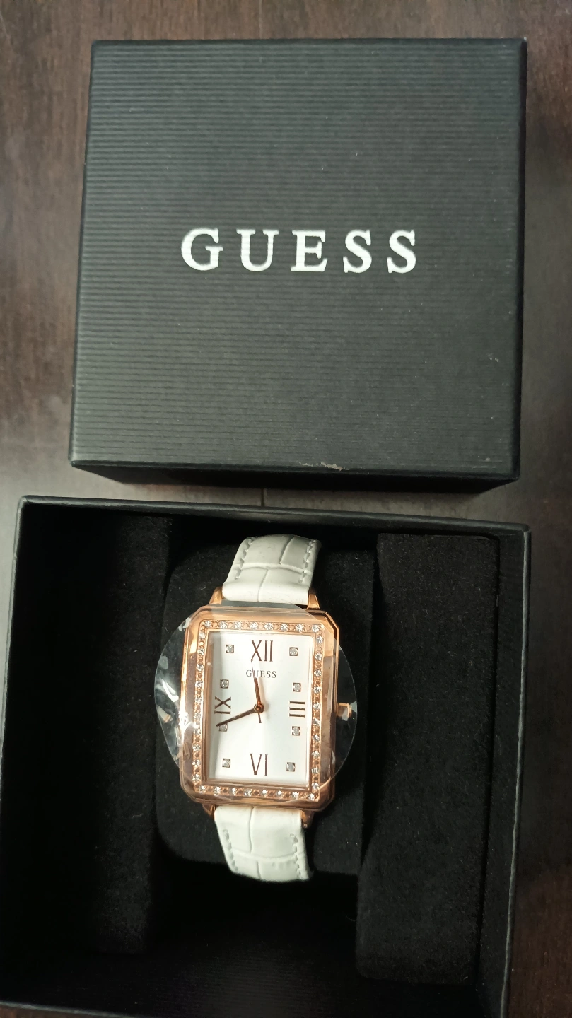 White leather band. Rose gold square face. Rhinestone accents. New in box.