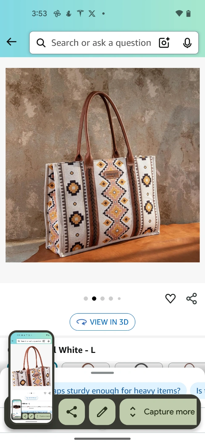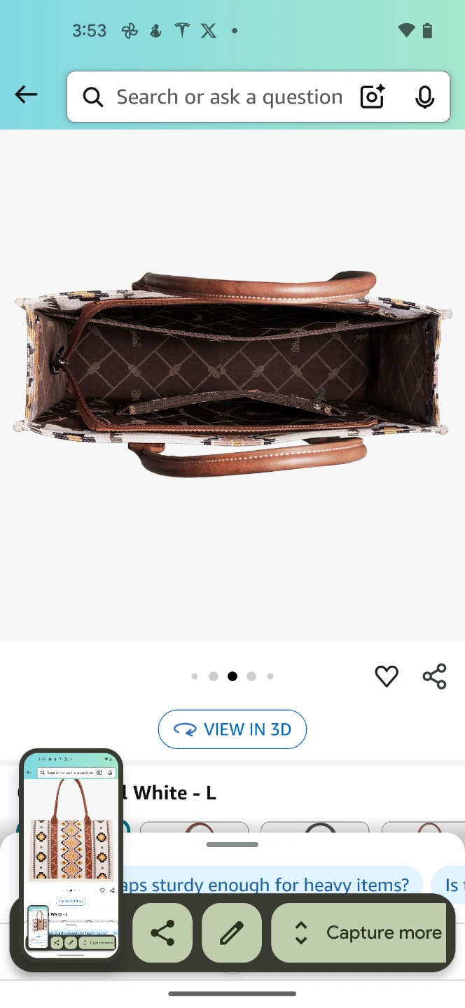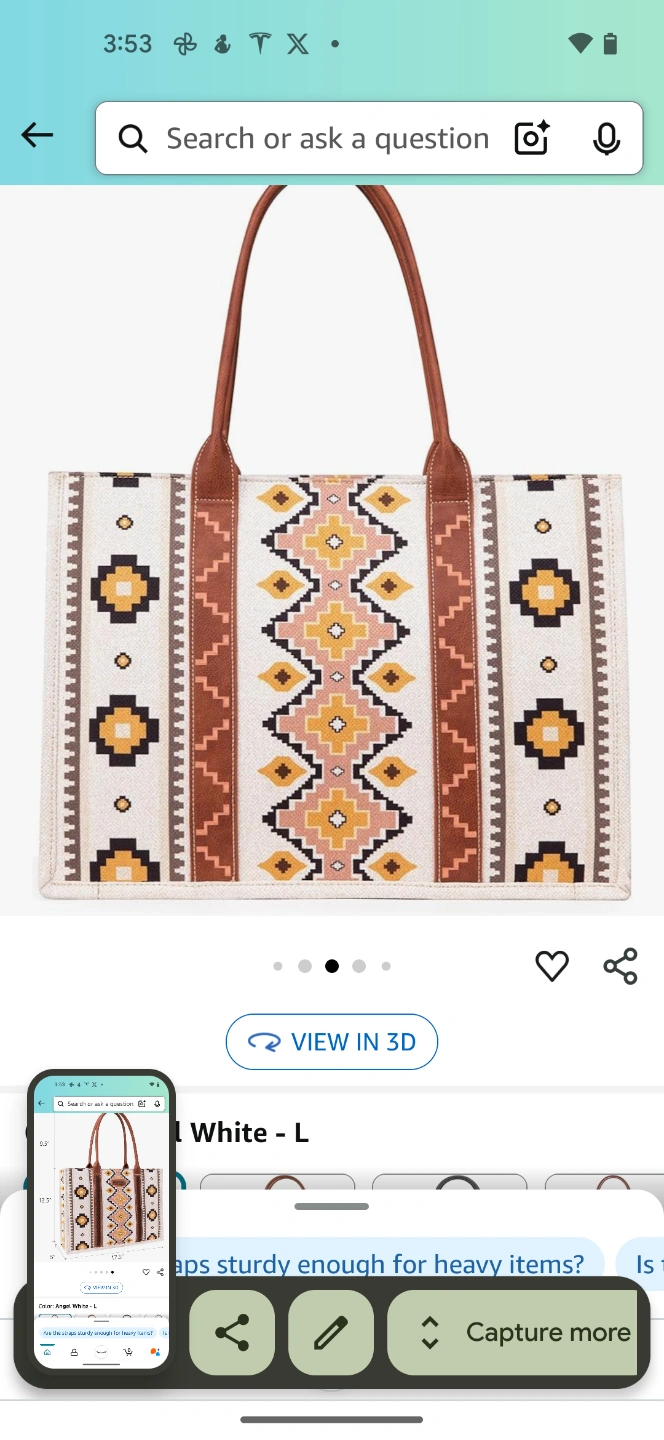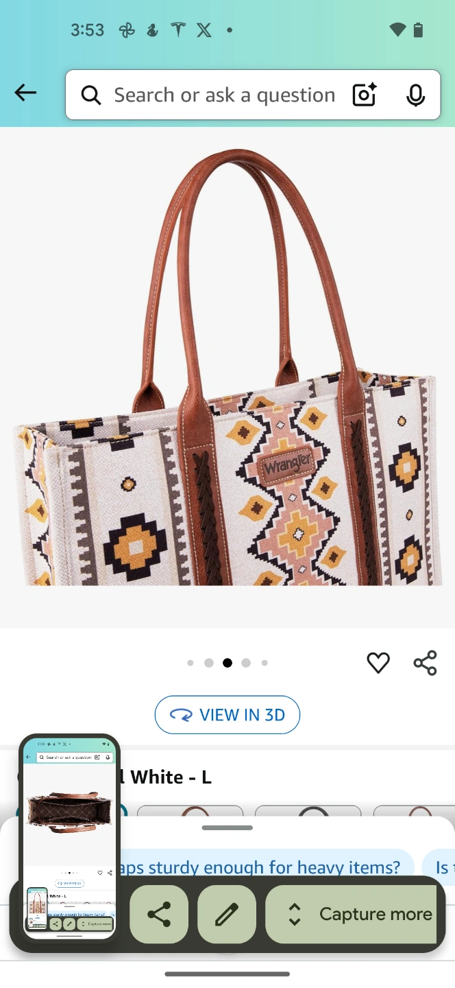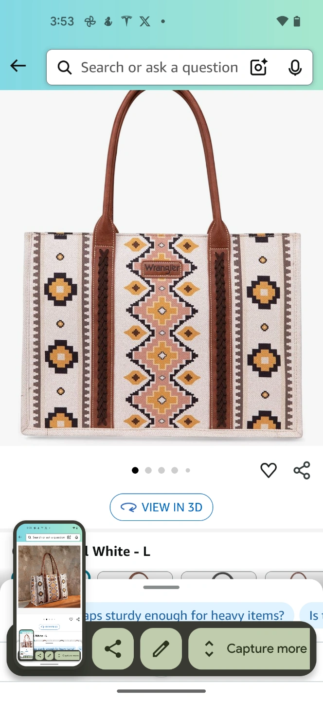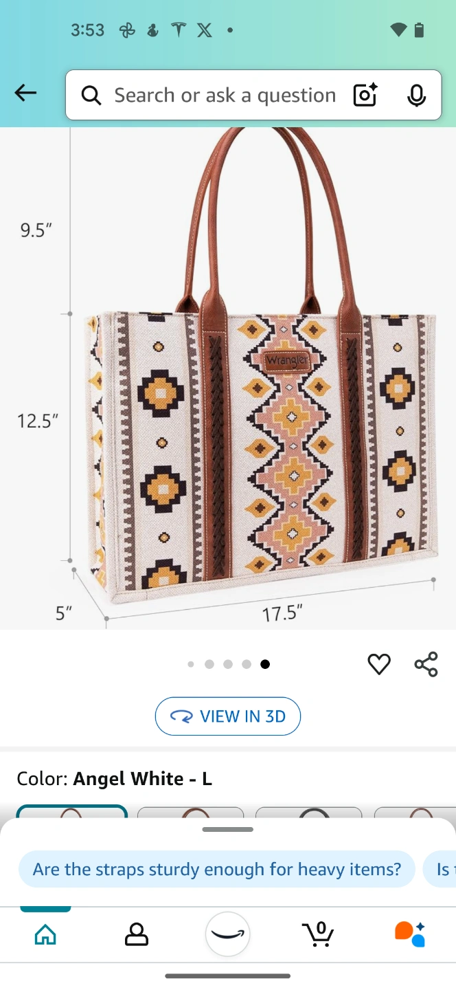 Large tote bag. Brown leather handles. Off-white canvas body. Southwestern-inspired pattern. Multiple interior pockets. Measures approximately 12.5" x 17.5" x 5".