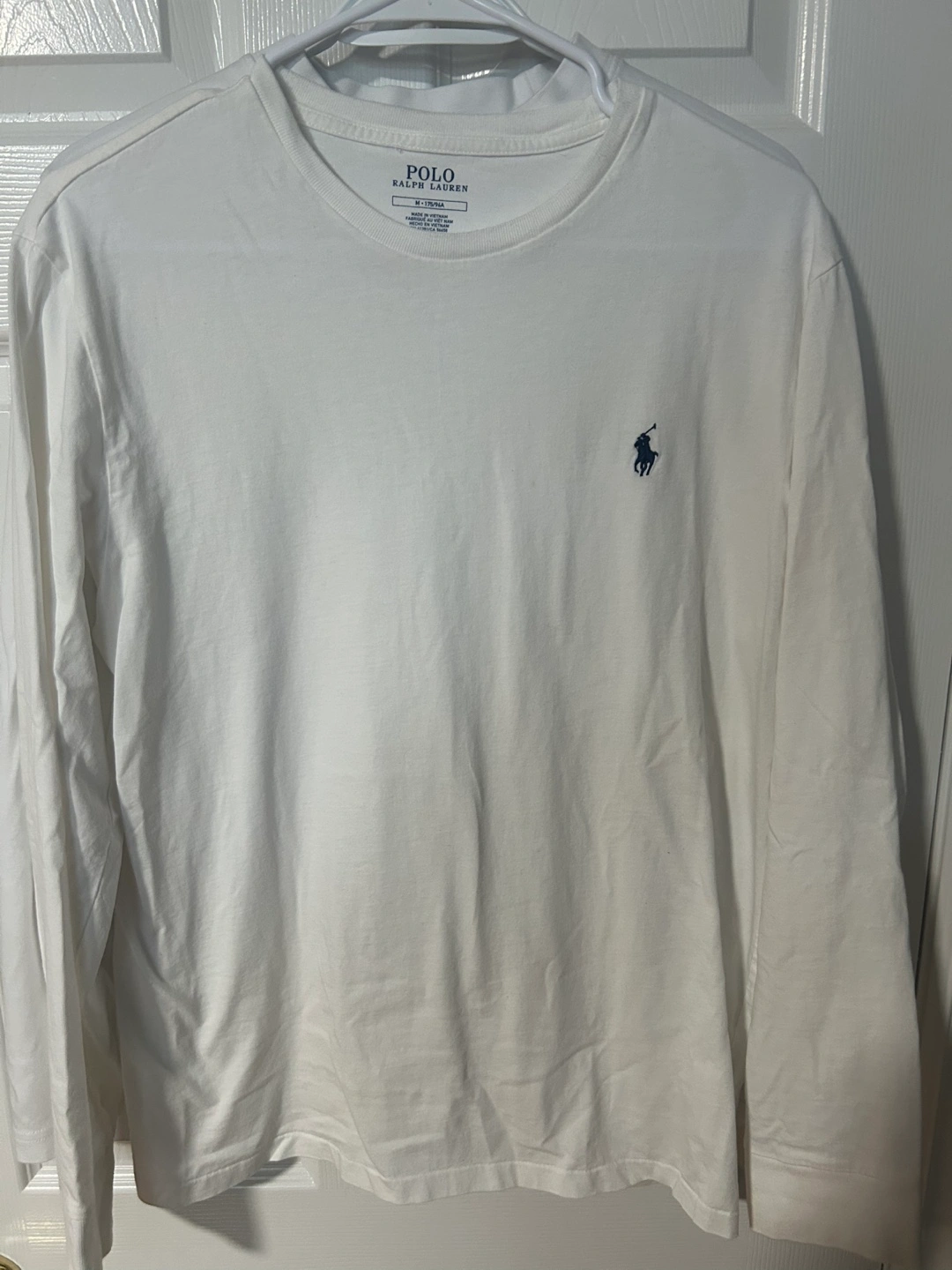 Men's white long-sleeve crew neck t-shirt. Small embroidered logo. Size Medium.