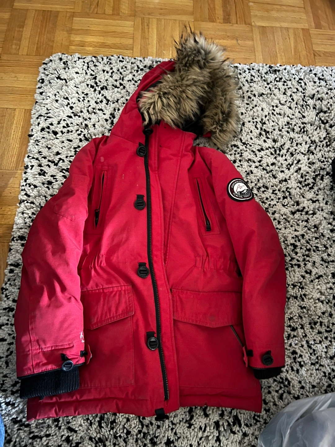 Warm winter coat. Features a faux fur-lined hood and multiple pockets. Red colour. Good for cold weather. Pick up only Located near Mt. Pleasant and Eglinton Ave East