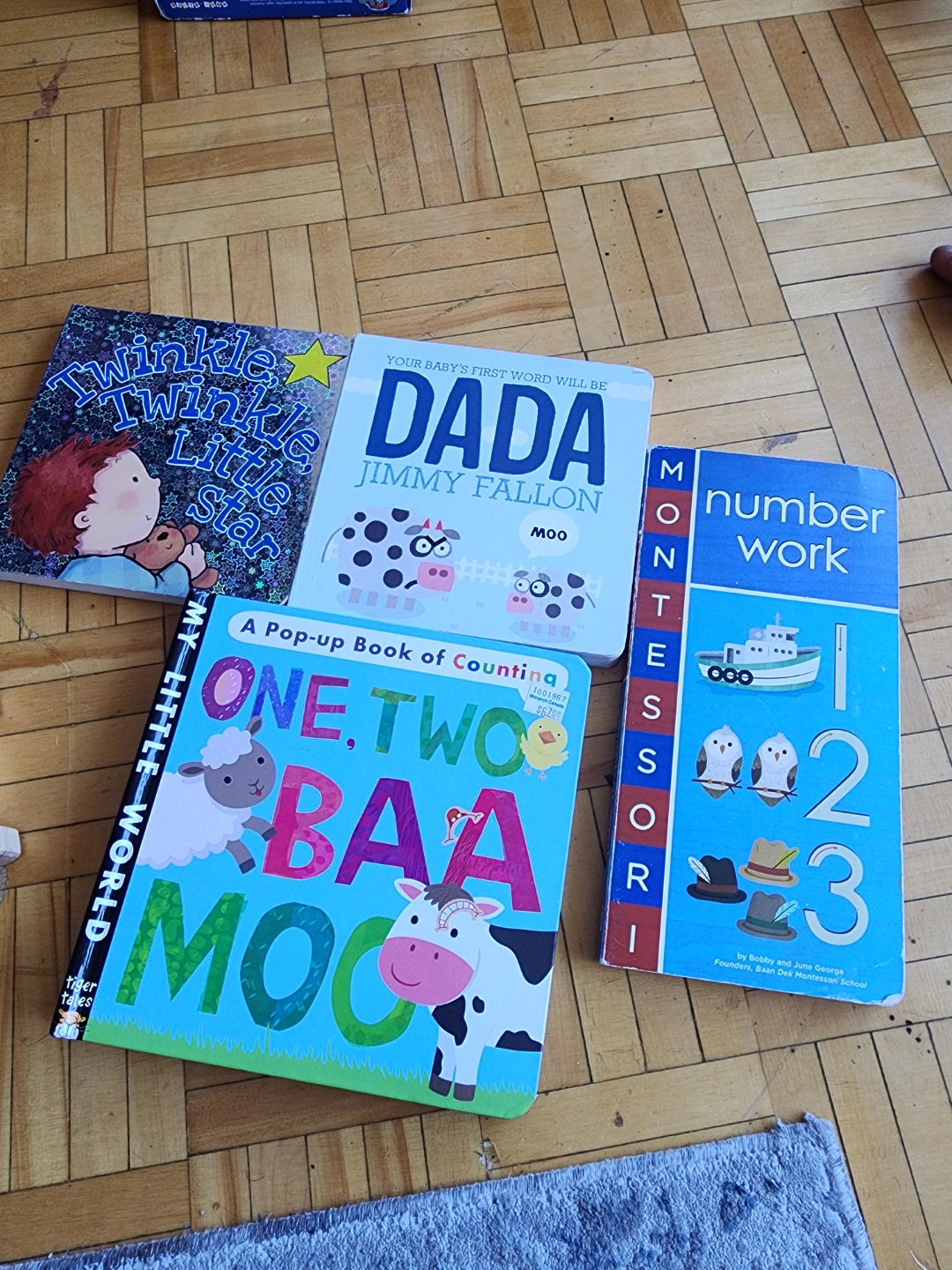 Set of four used children's board books. Titles include *Twinkle Twinkle Little Star*, *Dada* by Jimmy Fallon, *One, Two, Baa Moo* and *Number Work*. Suitable for toddlers and preschoolers.