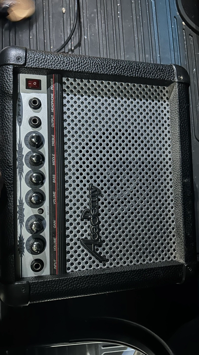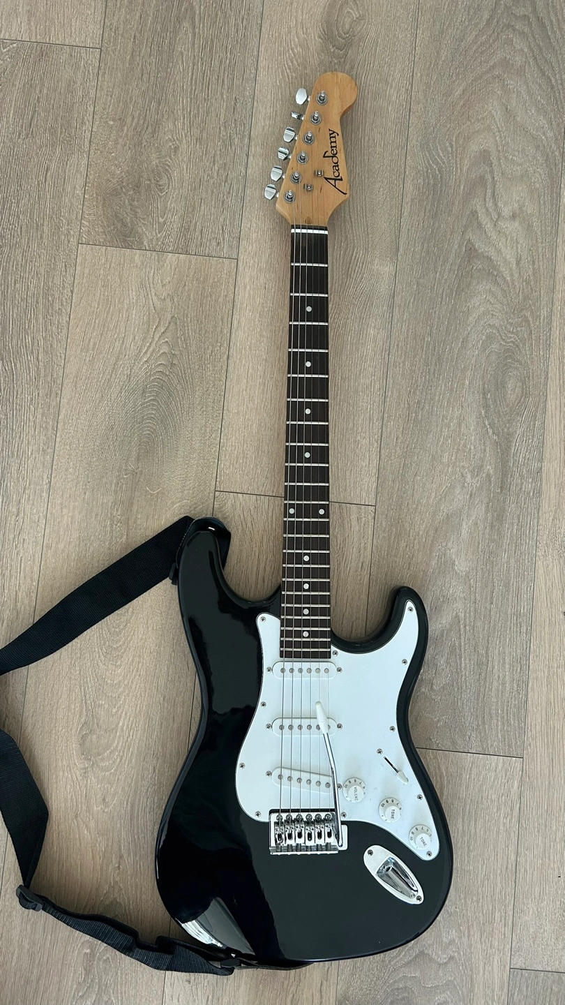 Guitar amplifier and electric guitar. Includes guitar strap. Great for beginners. Amplifier model GP-15. Black guitar. Good condition.