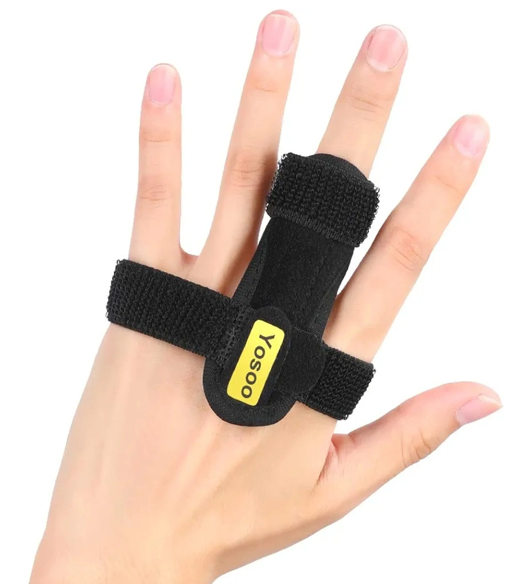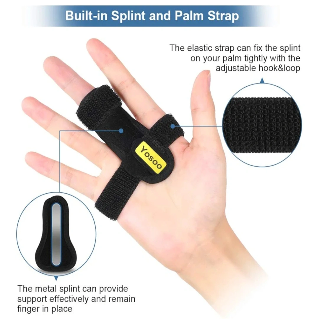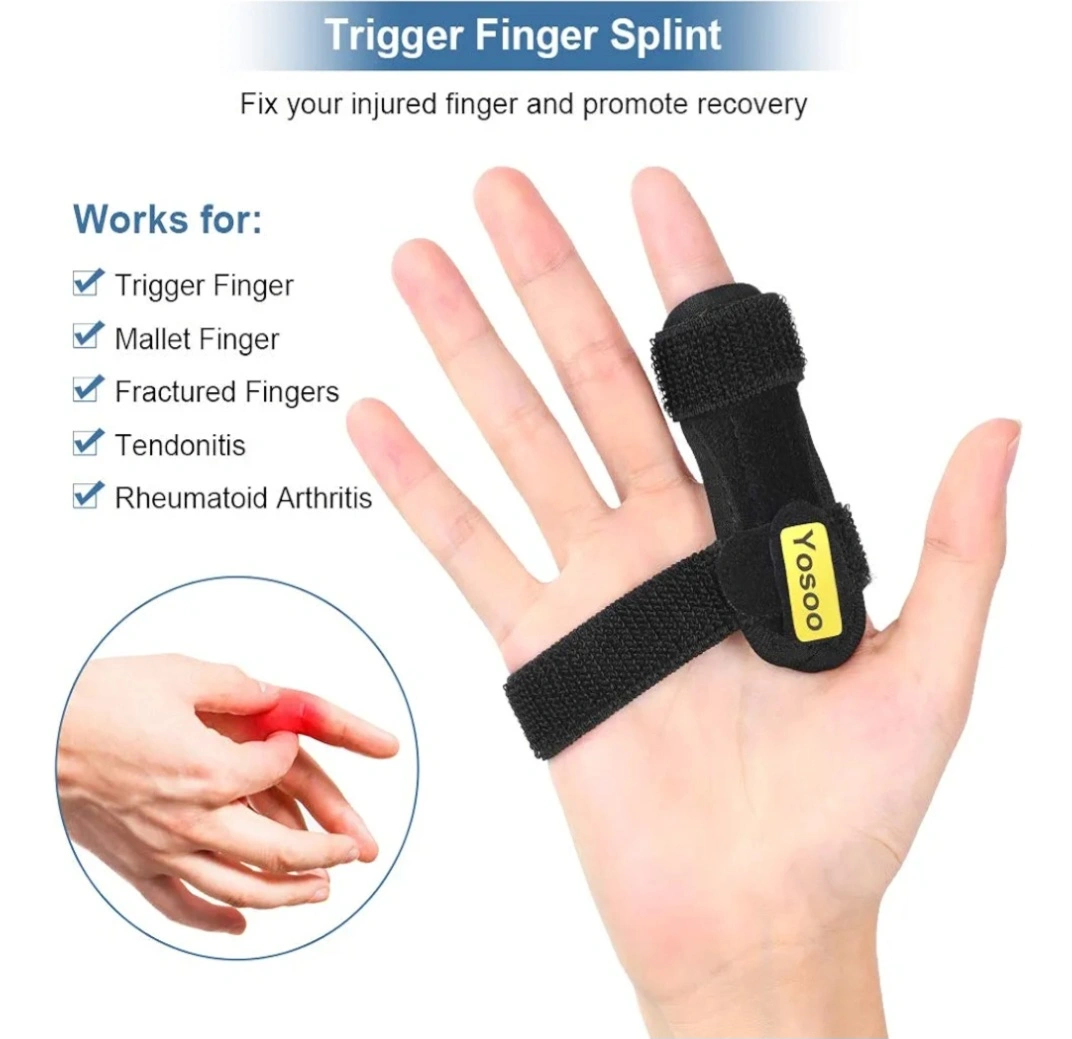Adjustable finger splint. Supports trigger finger, mallet finger, fractured fingers, tendonitis, and rheumatoid arthritis. Features a built-in splint and palm strap. Hook and loop closure.