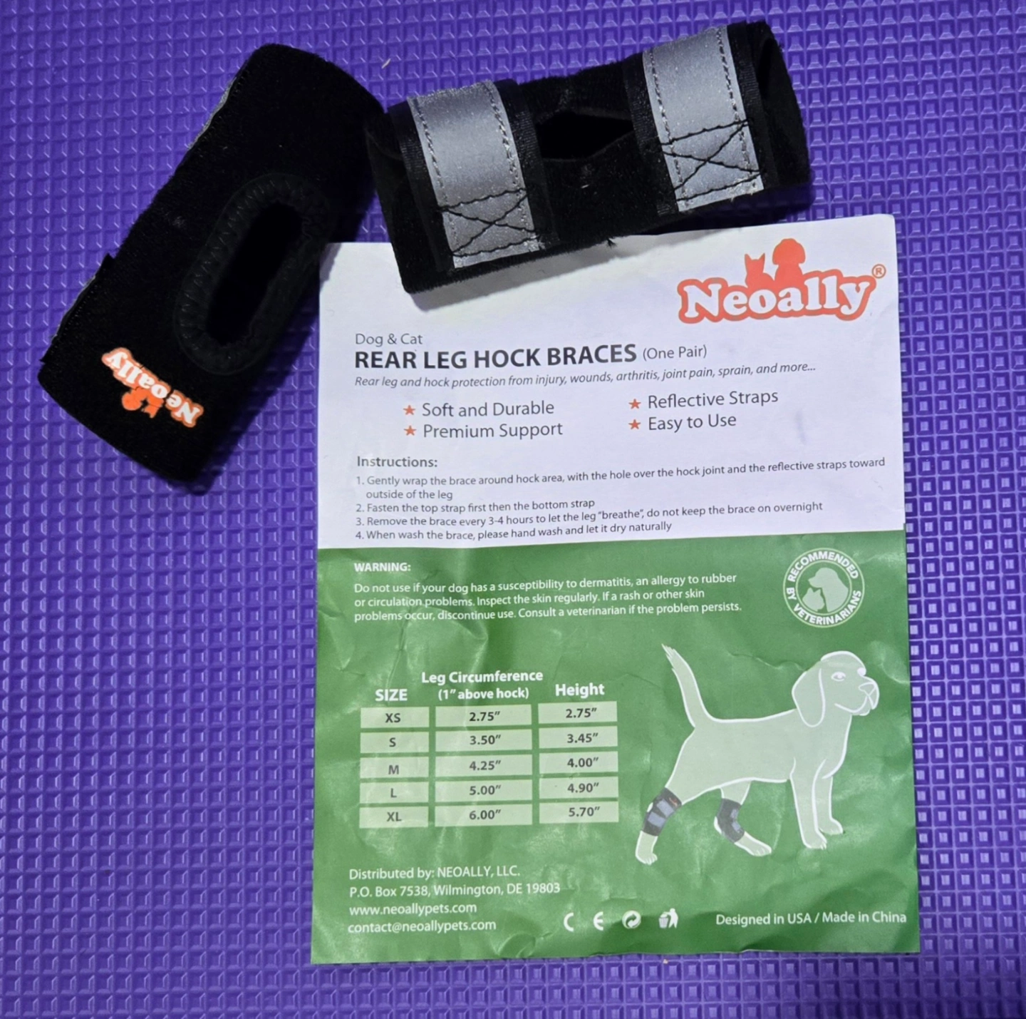 Pair of black rear leg hock braces. Soft, durable, and easy to use. Features reflective straps. Designed for injury, wound, arthritis, joint pain, and sprain prevention.