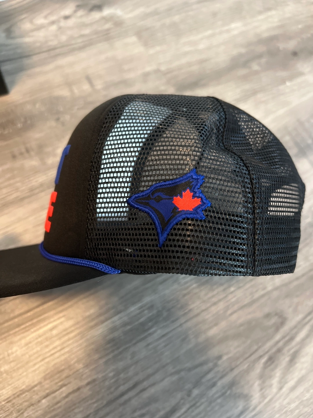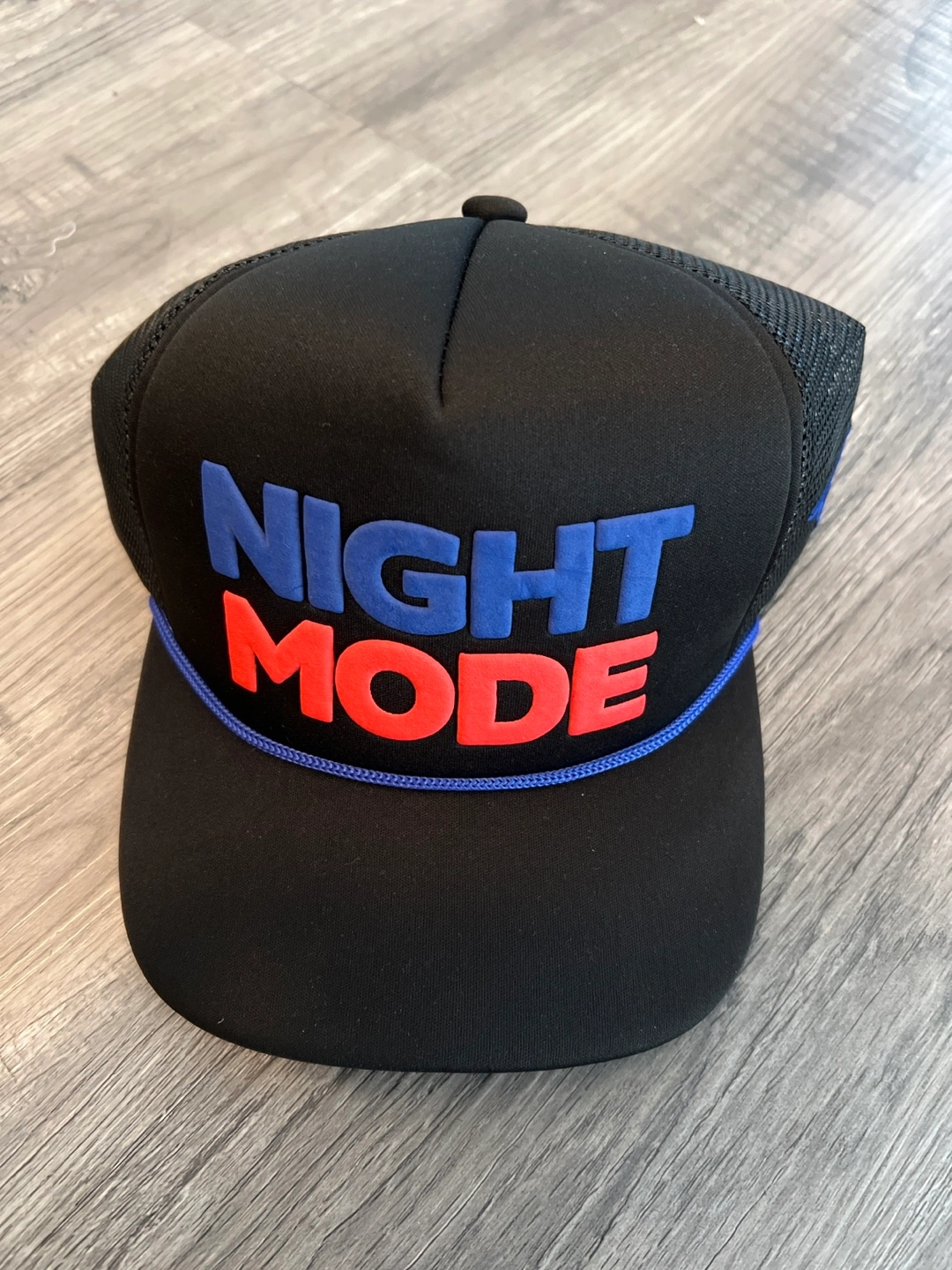 Black trucker hat. Features raised red and blue lettering spelling out NIGHT MODE. Blue Jays logo on the back. Adjustable. One size