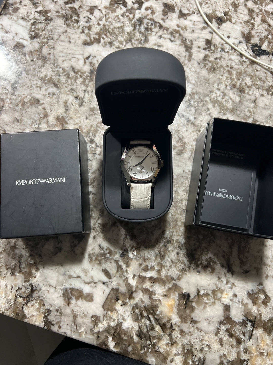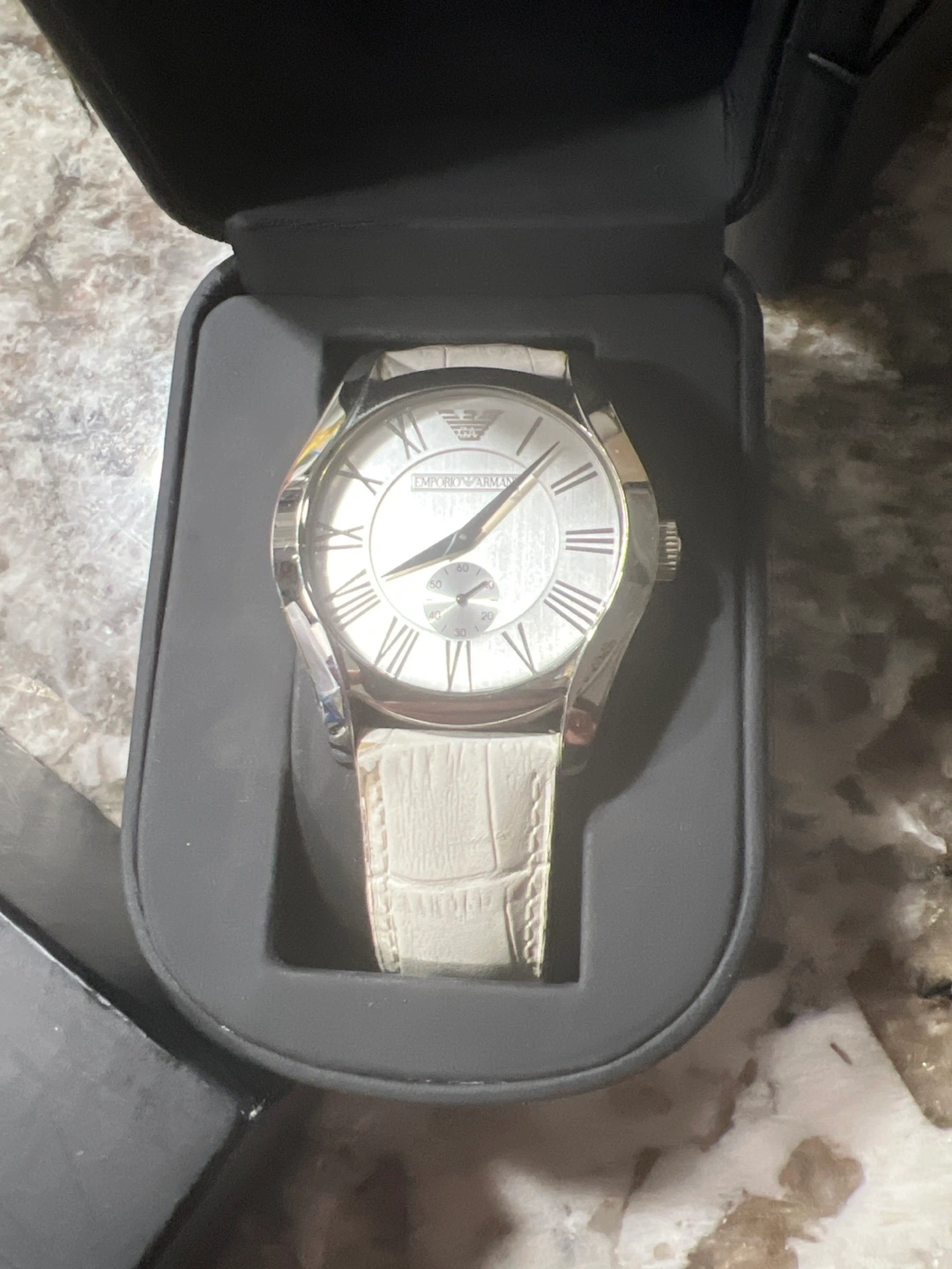 Elegant Emporio Armani watch. Silver tone case and Roman numeral markers. White leather band. Presented in original box. Quartz movement.