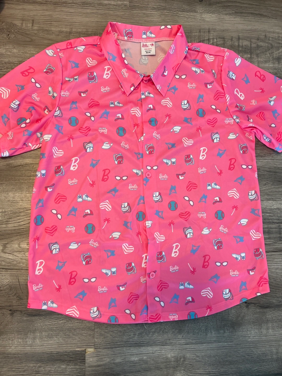 Unisex short sleeve button-up shirt. Pink with various Barbie-themed graphics and Blue jays Size XL.