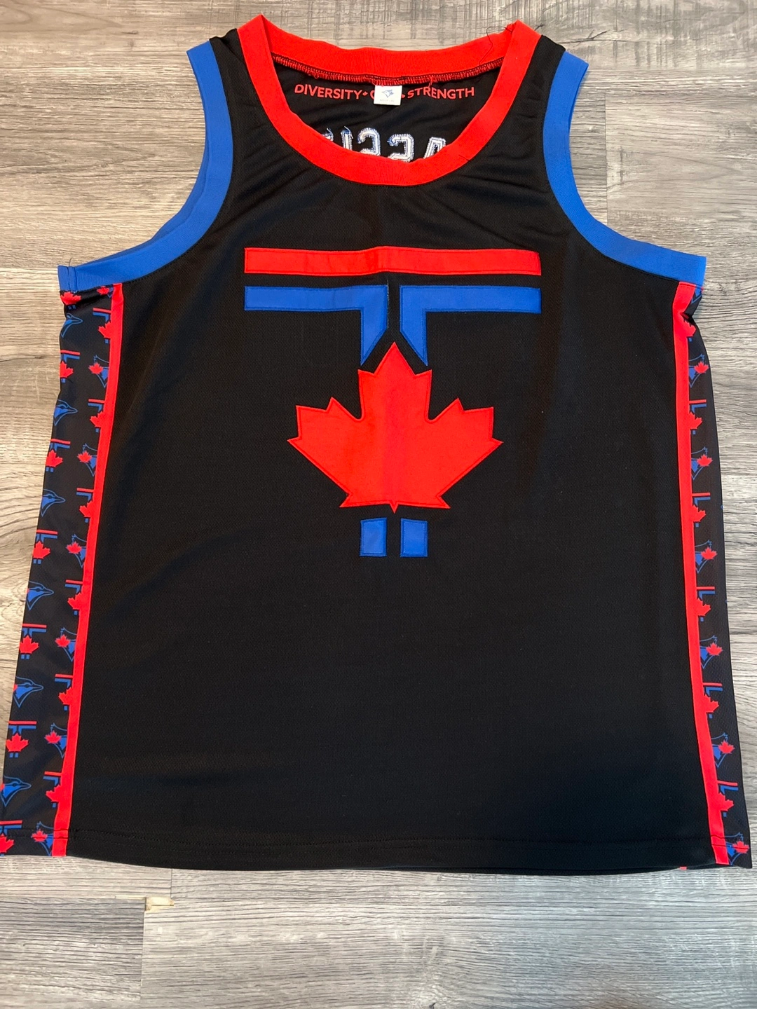 Black Toronto Blue Jays jersey. Features red and blue accents. Number 40 and Bassett on the back. Side panels with Blue Jays logos. Canada Maple Leaf on the front. Size XL city line version