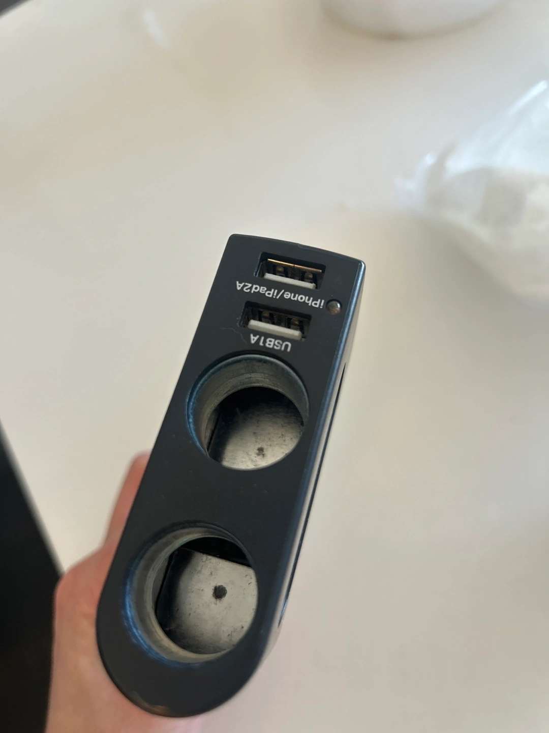 Portable car charger. Features two USB ports Perfect for charging multiple devices on the go.
