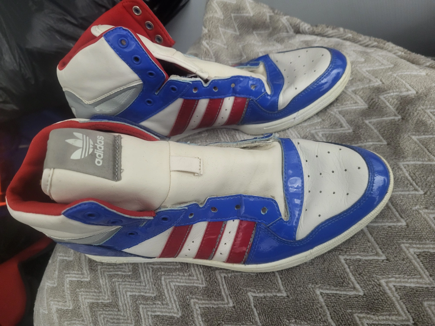 Pair of Adidas high top sneakers. Red, white, and blue colour scheme. High-top design. Some wear and tear visible.