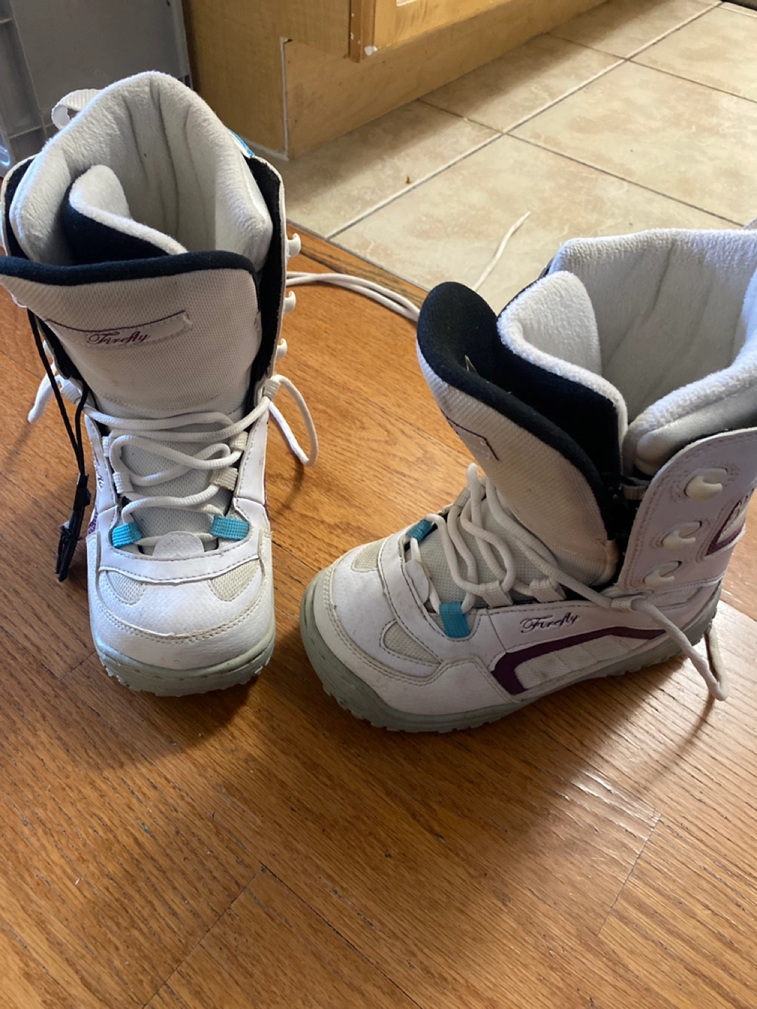 Pair of used Firefly snowboard boots. White with teal accents. Size US 3, UK 1, EU 33. Good condition. Lace-up style.