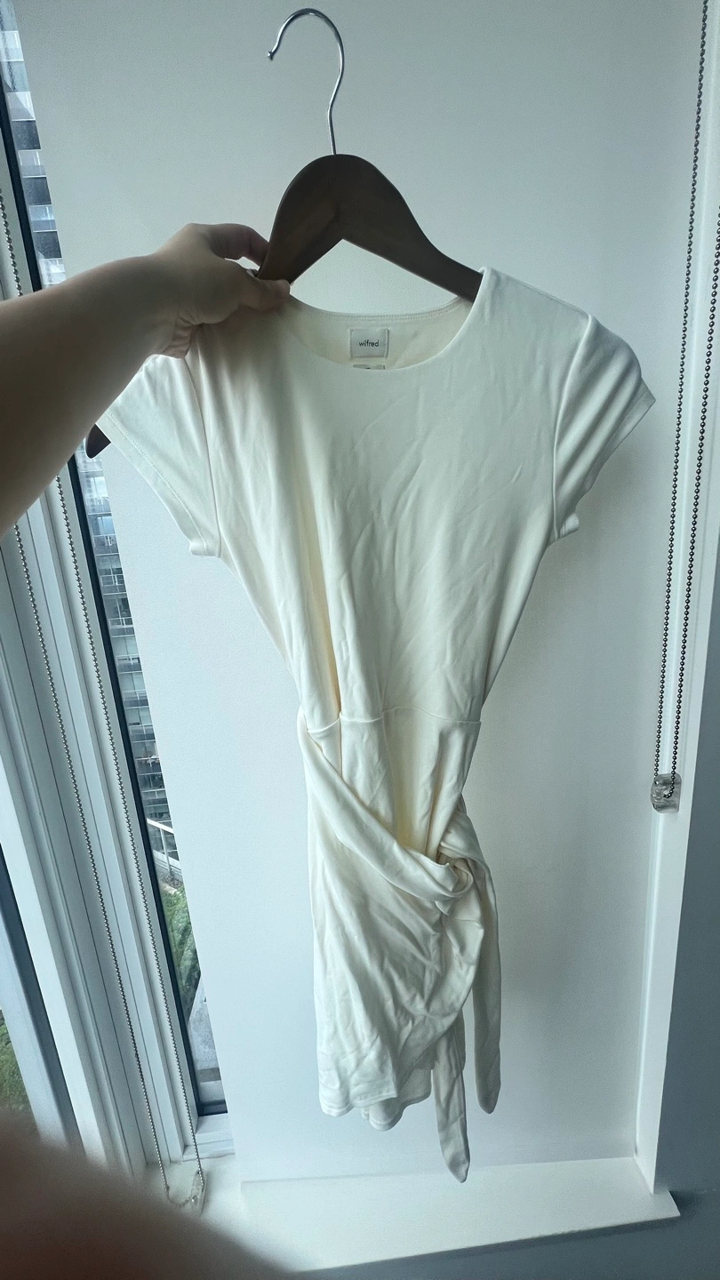 Cream-coloured mini dress. Features short sleeves and a wrap-style waist. Simple, elegant design.