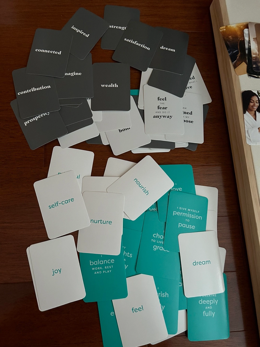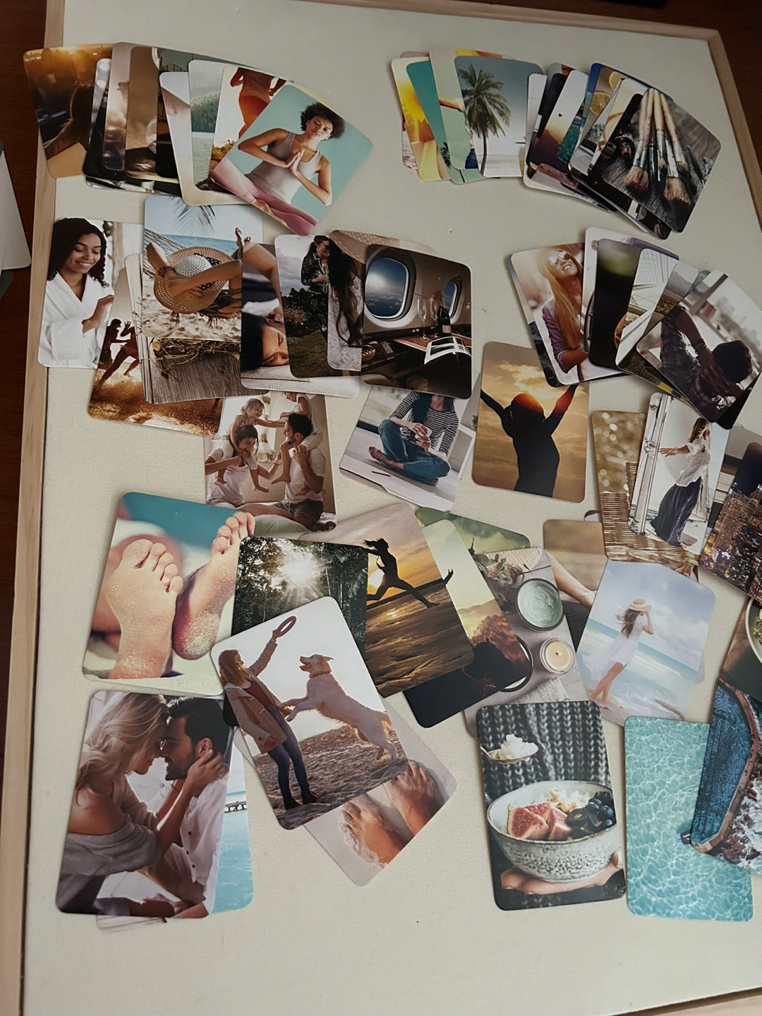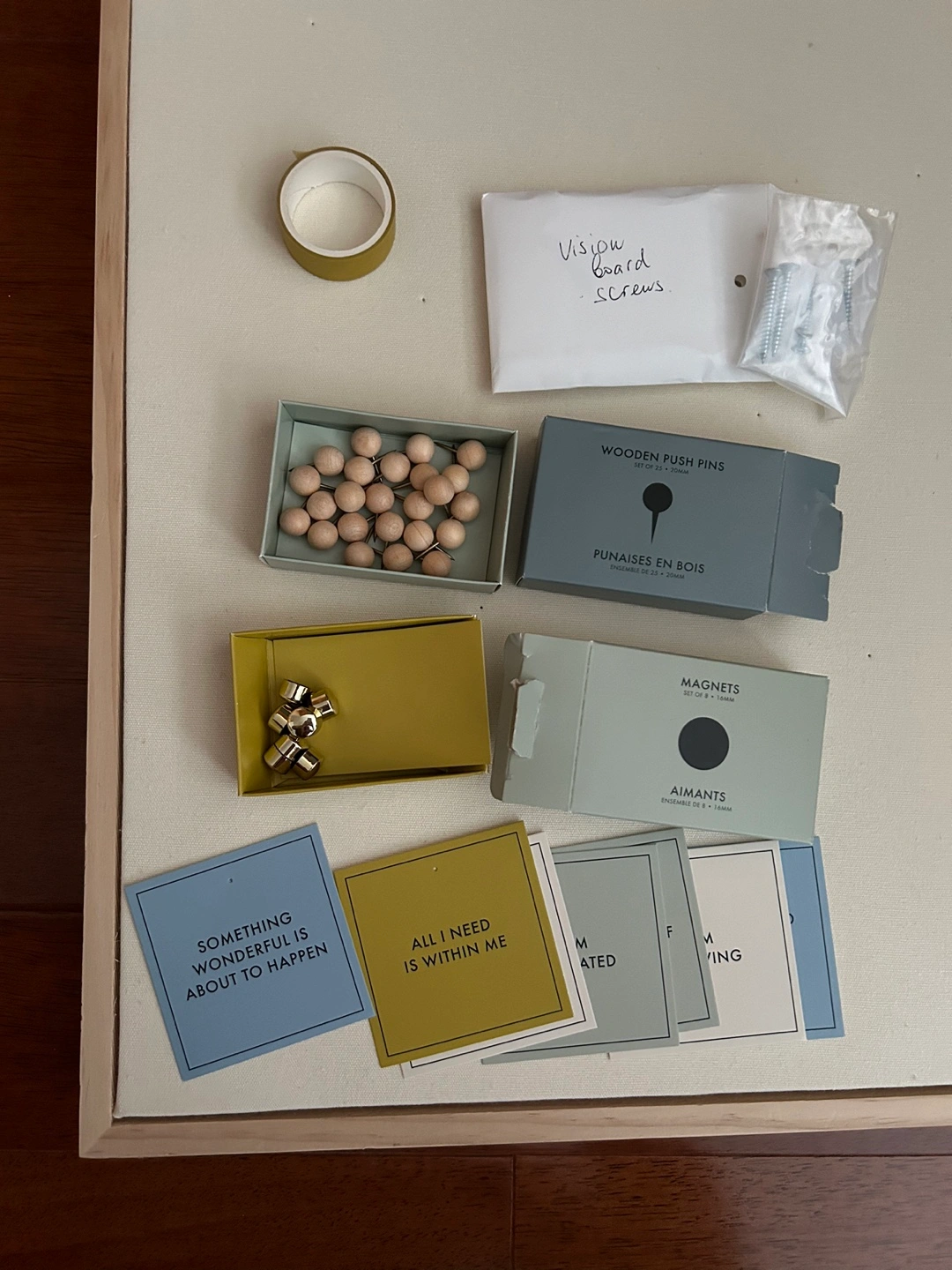 Vision board kit. Includes a framed corkboard, wooden push pins, magnets, and inspirational cards. Perfect for creating your dream vision board. Natural wood frame. Used few times briefly Like new But has some holes from using pins 📌 Bought from Indigo Size 18” x 24”