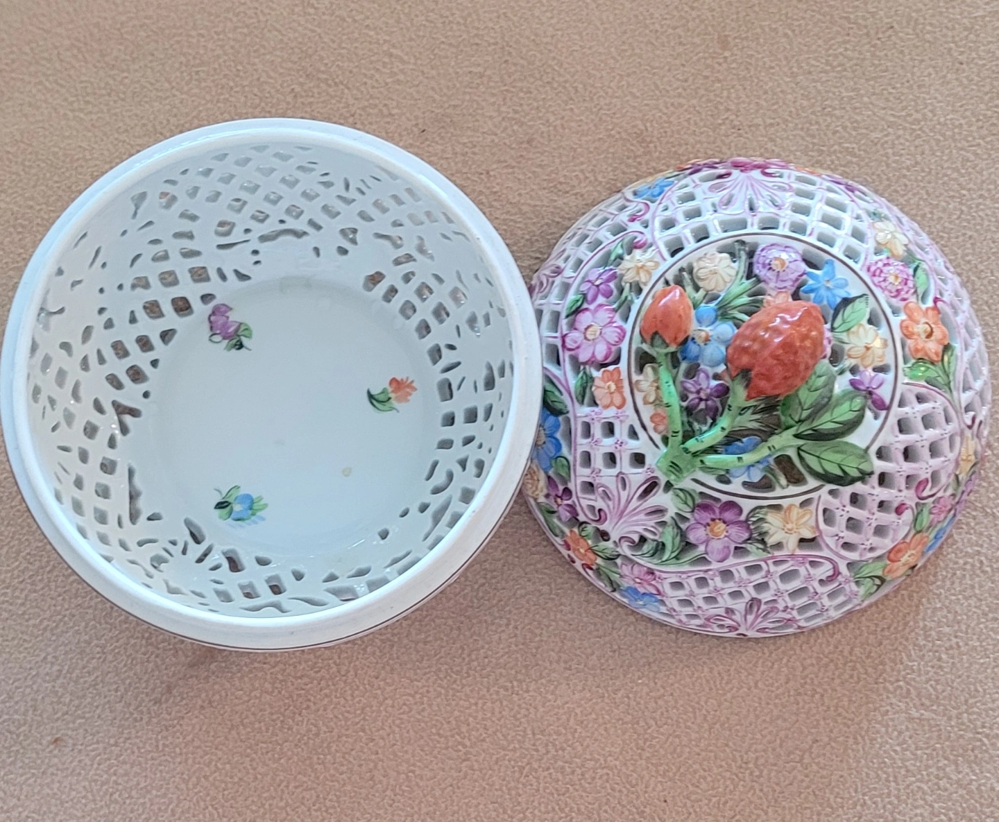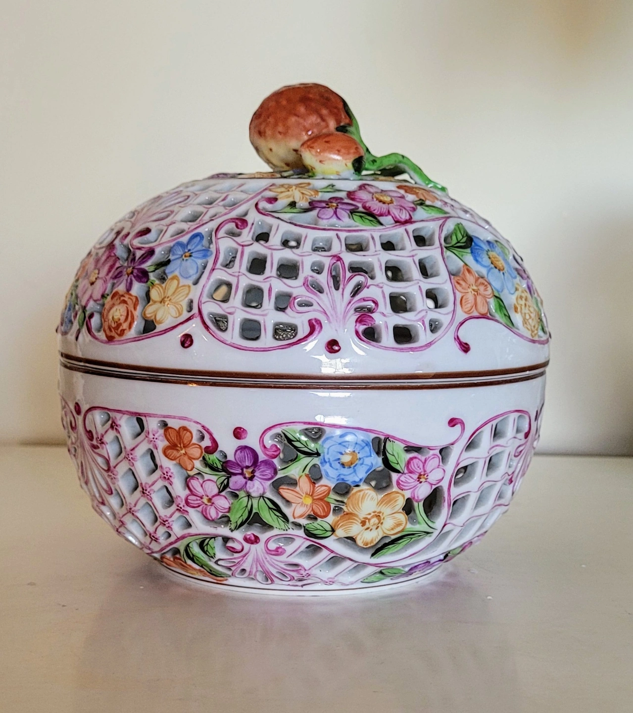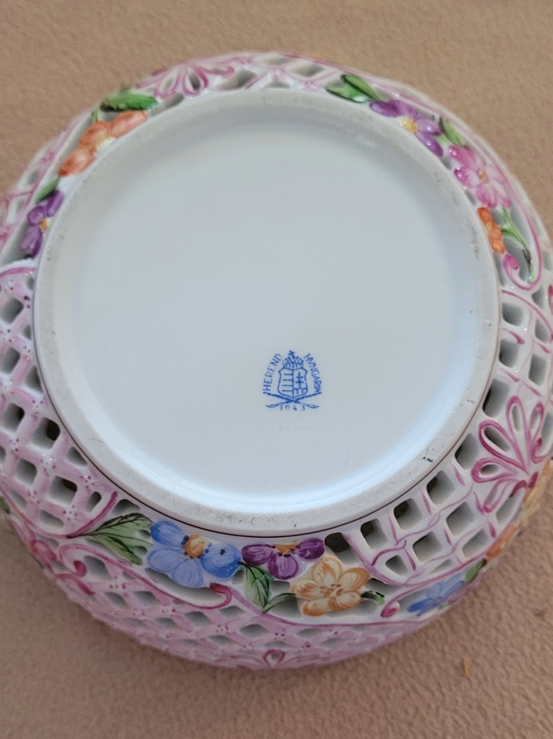 Add a touch of elegance to your collection with this stunning Herend porcelain candy dish. This is a good condition, showcasing the intricate craftsmanship and delicate floral design that Herend is known for. The reticulated pattern and strawberry finial make it a unique and eye-catching addition to any room. Perfect for collectors or as a sophisticated gift. * Brand: Herend * Material: Porcelain * Design: Floral with reticulated pattern and strawberry finial * Dimensions: Approximately 6 inches in diameter This exquisite candy dish is priced at $403 on eBay. Please remember, if the ad is up, it's still available!
