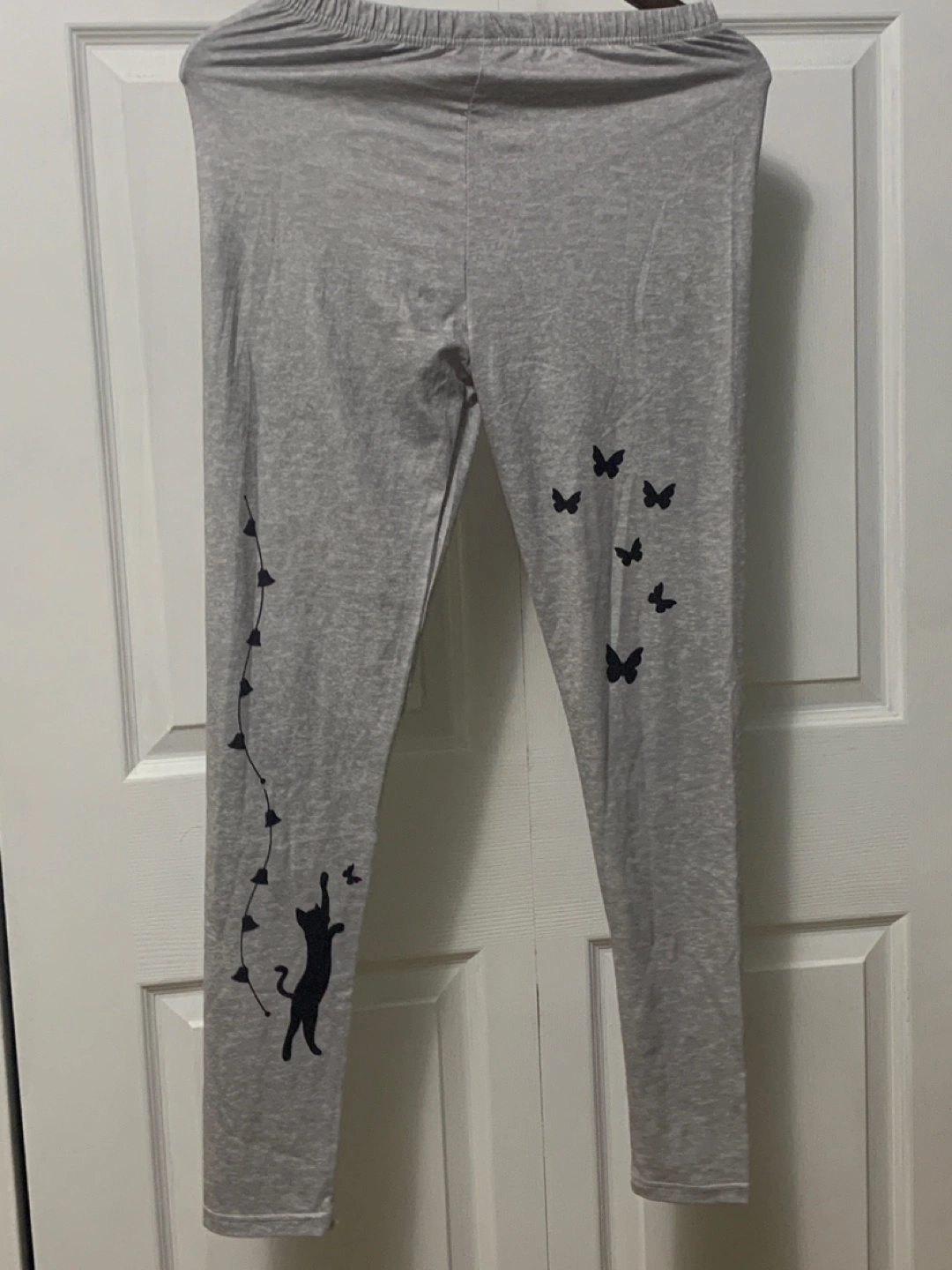 Cute grey leggings. Playful design of a cat with butterflies. Soft and stretchy material. Comfortable fit.