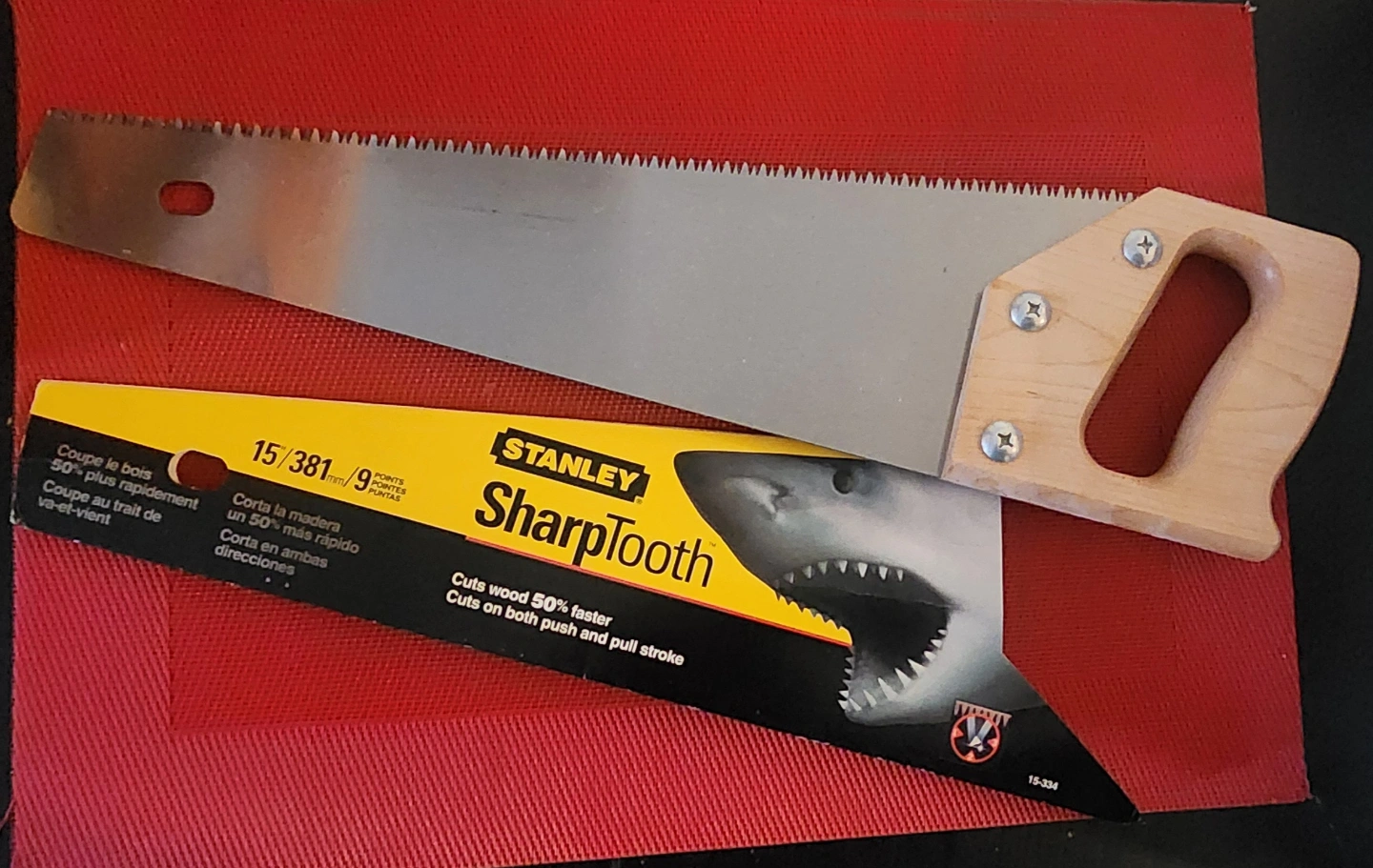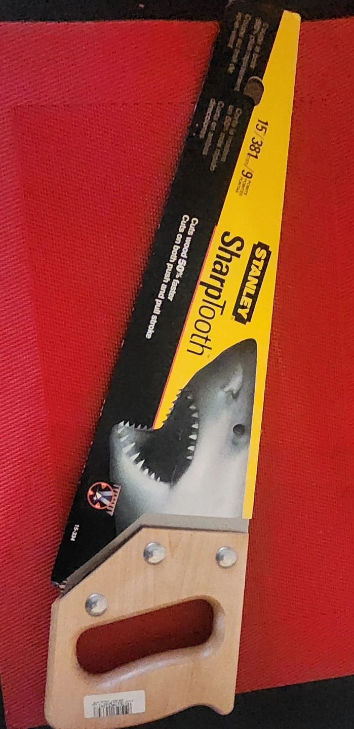New Stanley Sharptooth hand saw. Wooden handle. Cuts wood 50% faster. Cuts on both push and pull strokes. In original packaging.