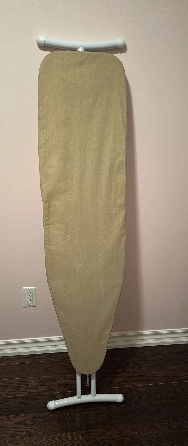 Beige ironing board cover. White metal frame. Folds for storage. Wall mounted.