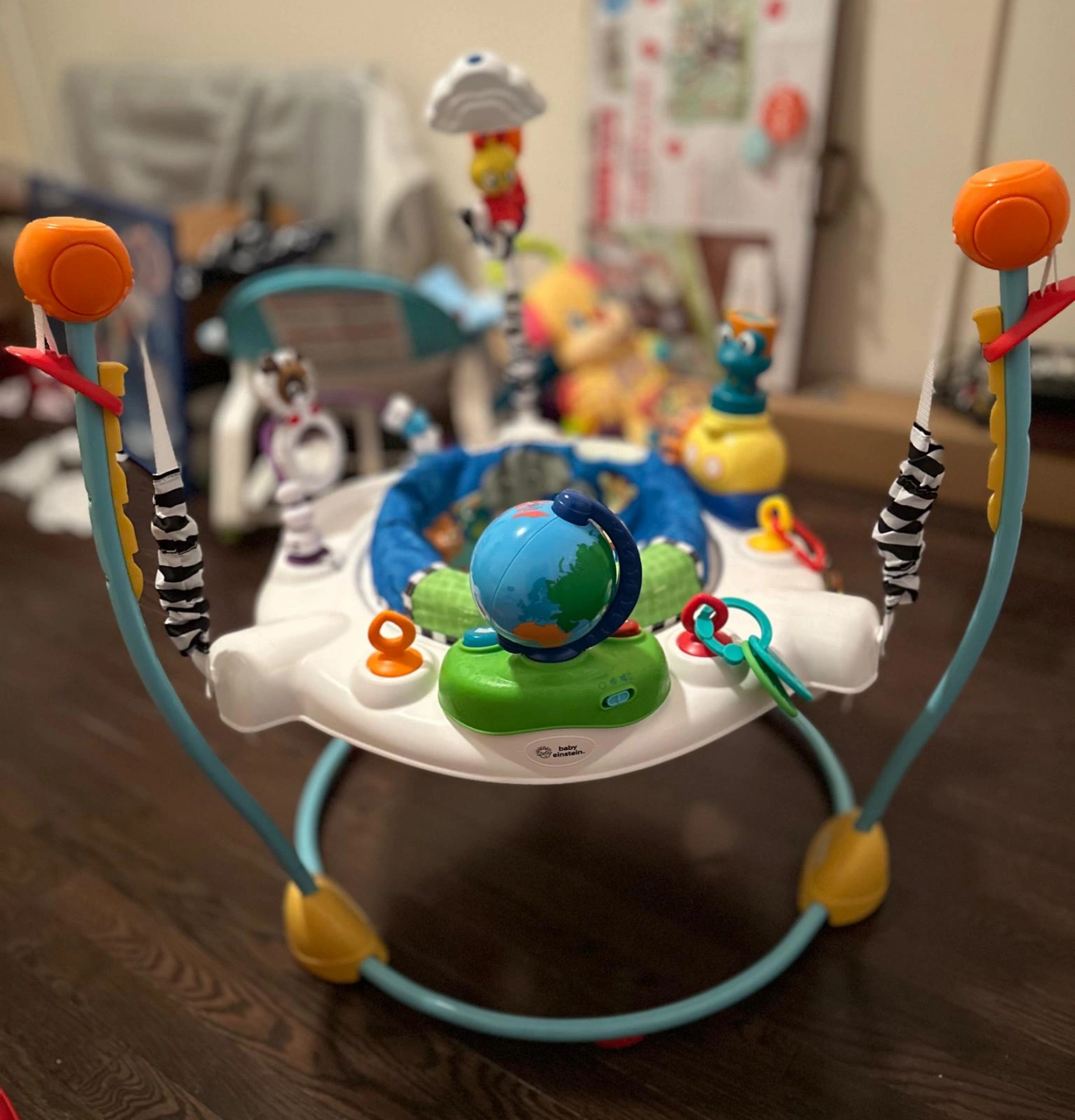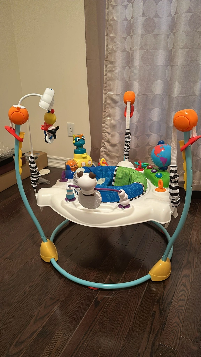 Baby jumperoo. Fun colourful design. Features various toys and activities. Great for encouraging baby's development.