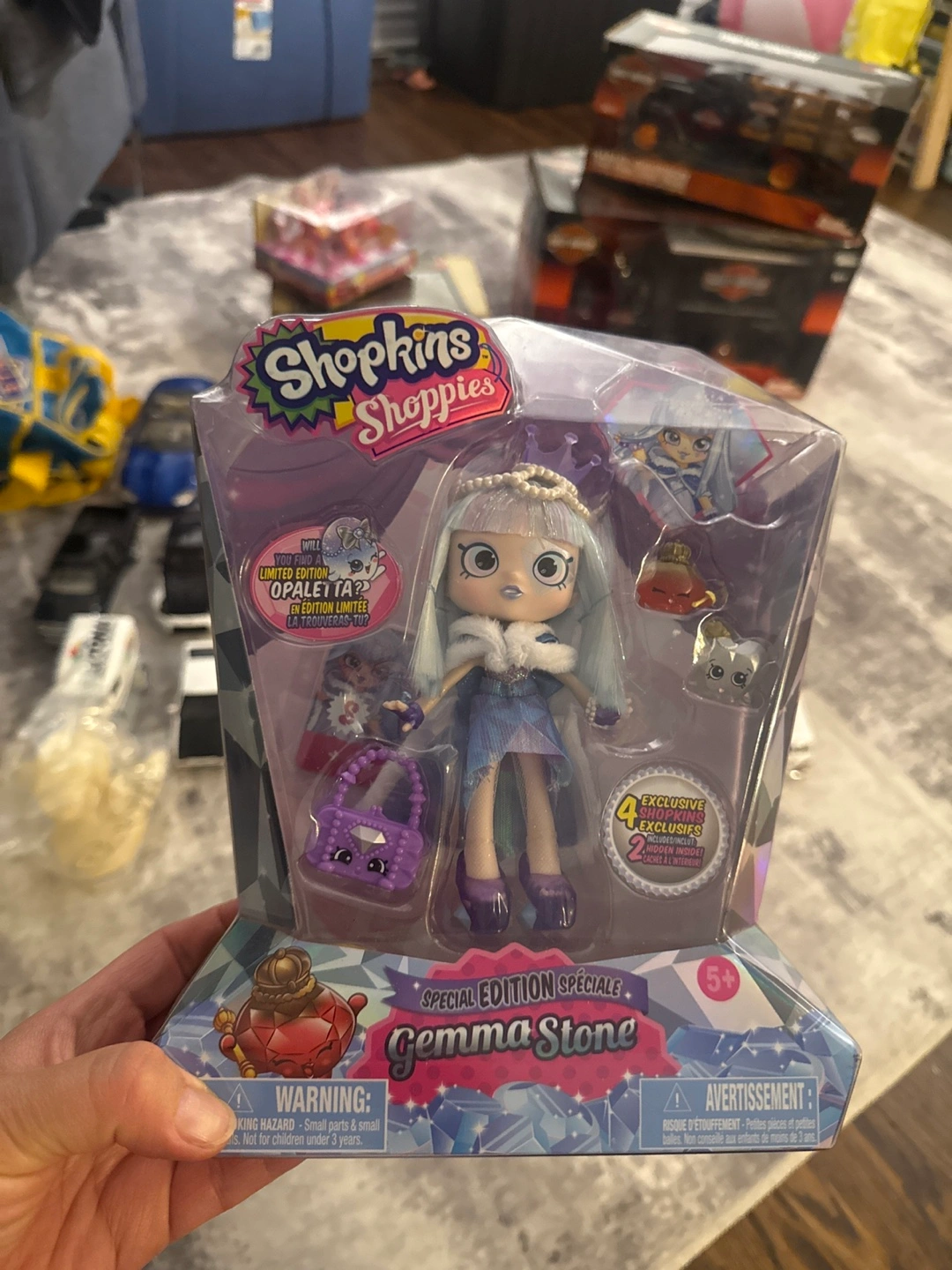 Limited edition Gemma Stone Shopkins Shoppies doll. Includes 4 exclusive Shopkins, 2 hidden inside. For ages 5+