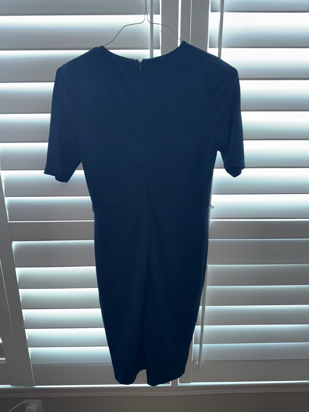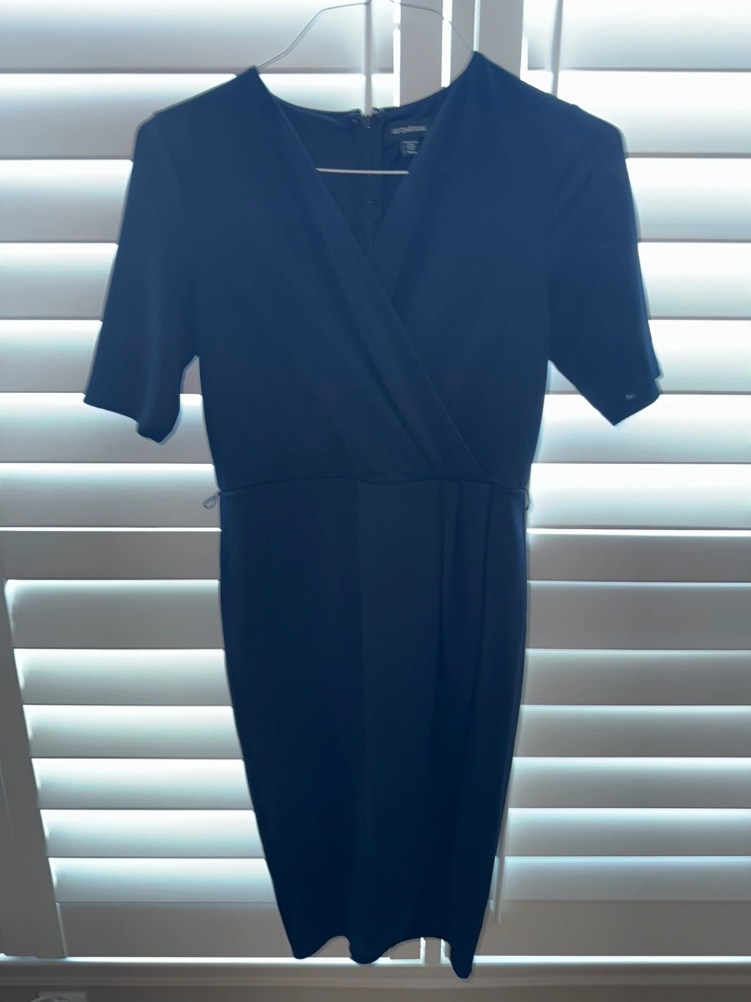 Navy blue wrap dress. Short sleeves. Knee length. Excellent condition. I don’t have the thin belt that came with the dress but any thin / chain belt will match. Brand: Le Chateau Size: Medium
