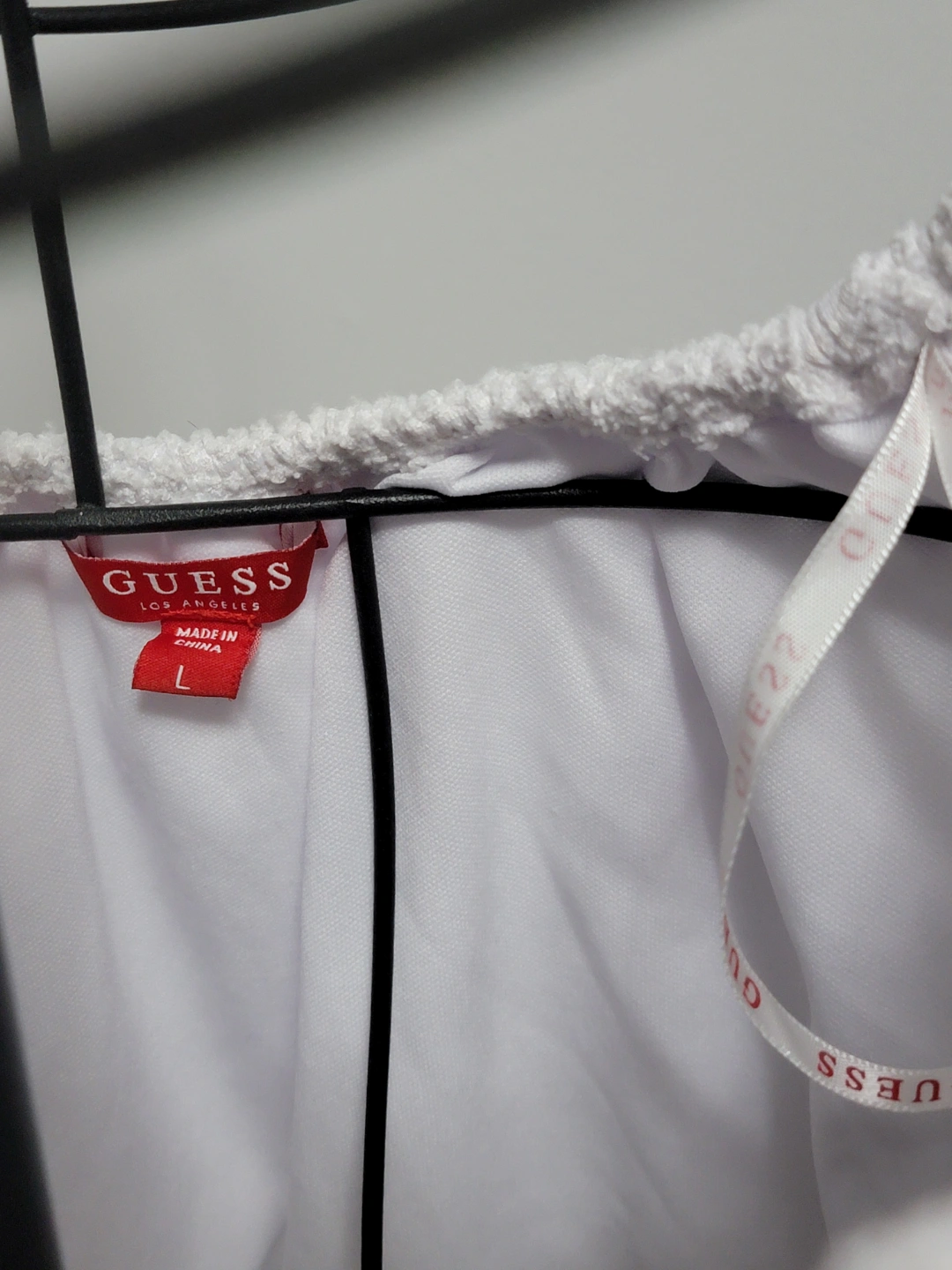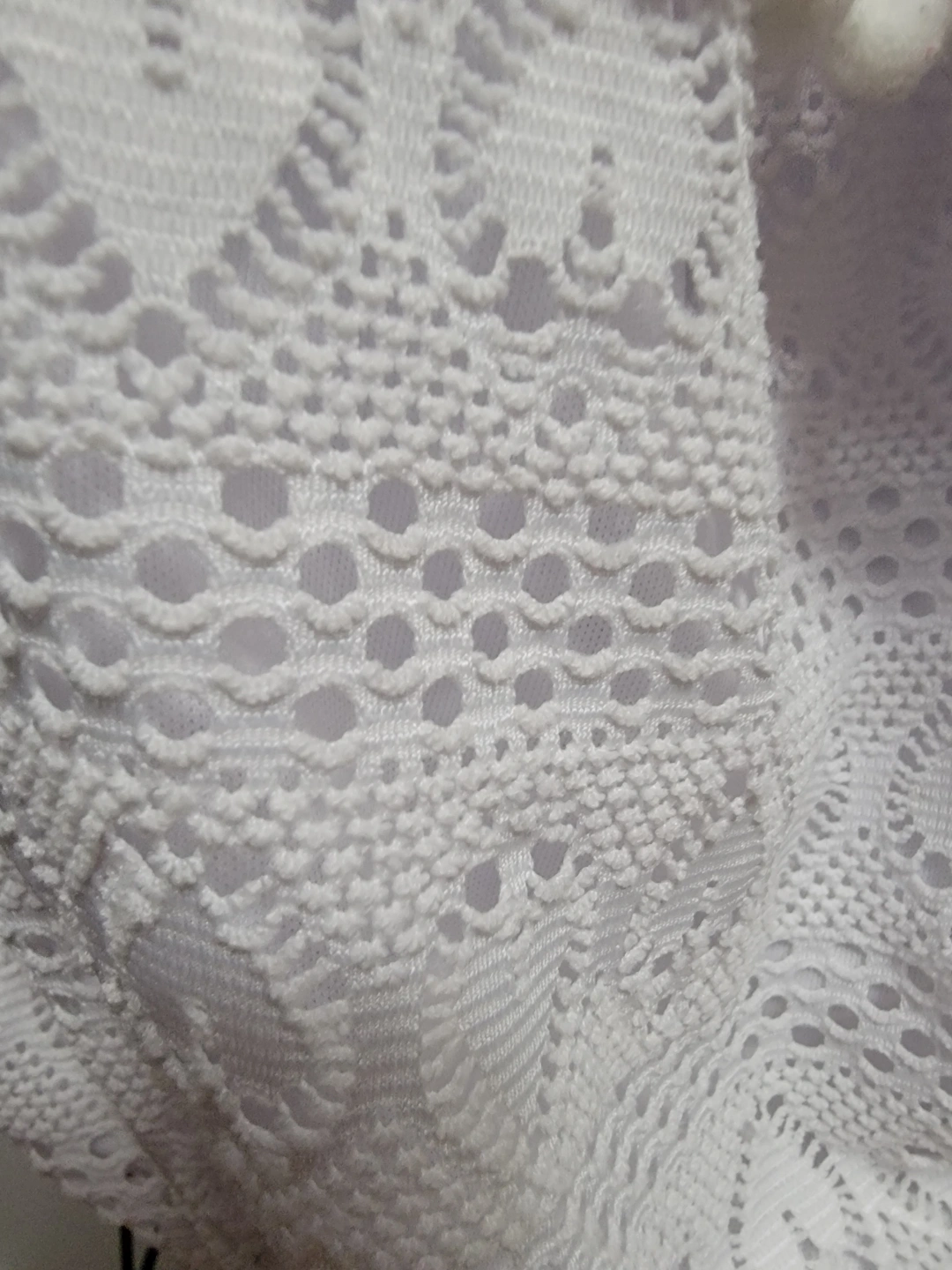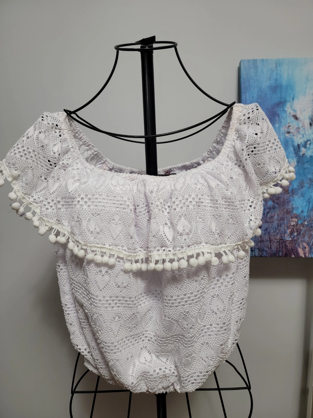 White crop top. Off-the-shoulder style. Lace fabric. Pom-pom trim. Size large.