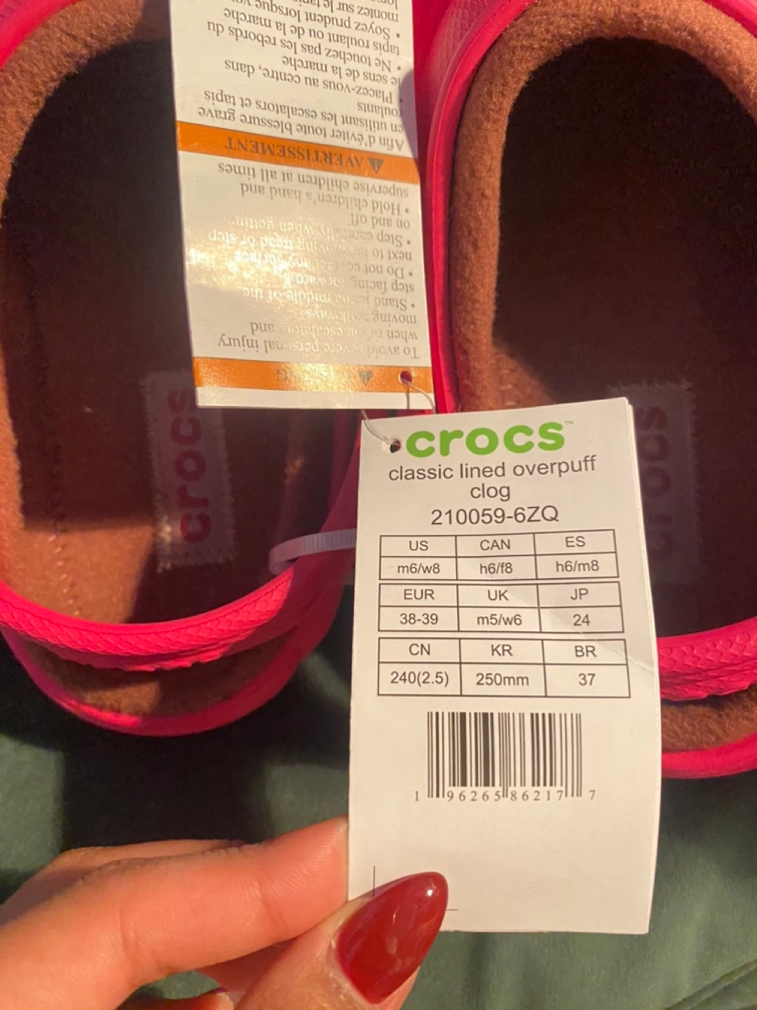 BRAND NEW Pink Crocs Classic Lined Overpuff clogs. Women's size 8. Brown fuzzy lining. Brand new with tags!!! Selling it because it’s too small for My wide feet 😔 Looks great and awesome for someone who adores pink!!