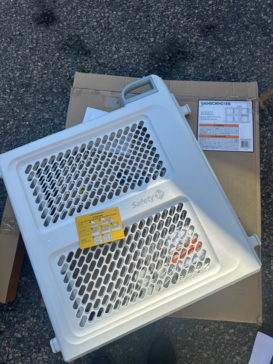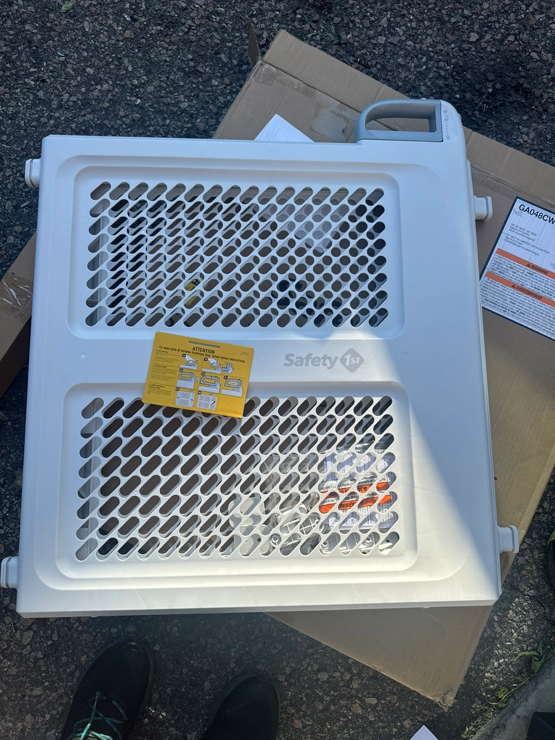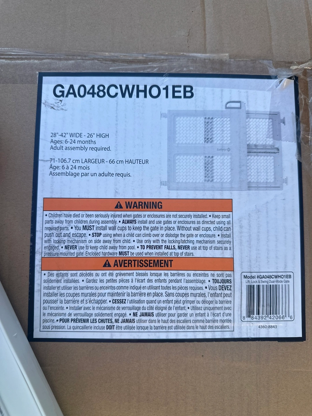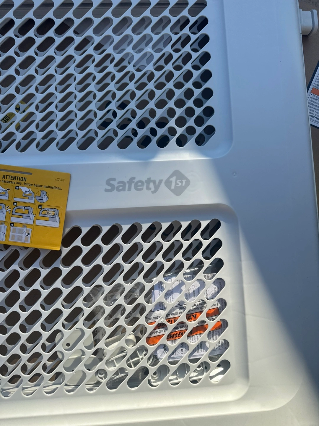 White metal baby gate. 28" - 42" wide, 28" tall. Pressure or hardware install. Lift, lock and swing functionality.