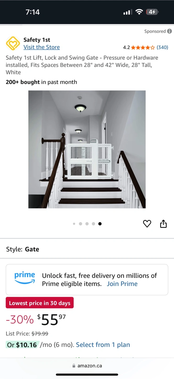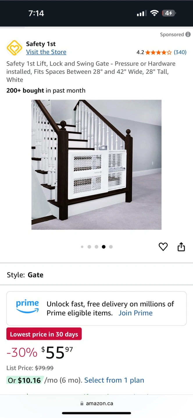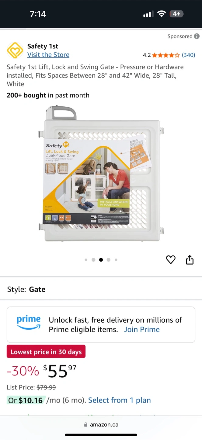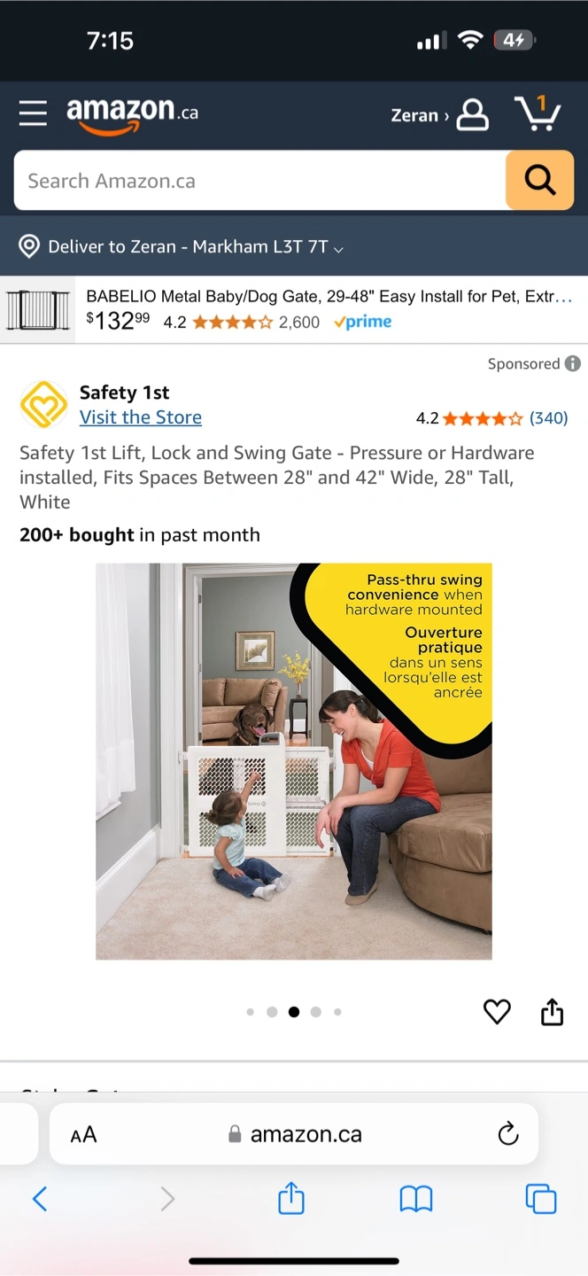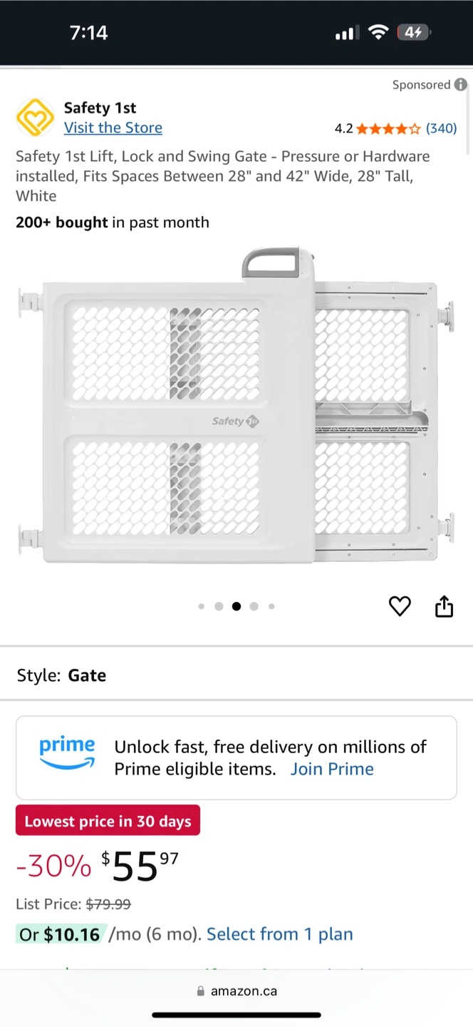 White metal baby gate. 28" - 42" wide, 28" tall. Pressure or hardware install. Lift, lock and swing functionality.