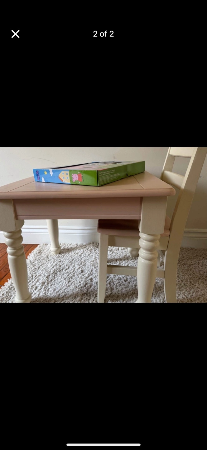 Adorable children's table and chair set. Light pink finish. Includes Peppa Pig floor puzzle. Perfect for playtime.
