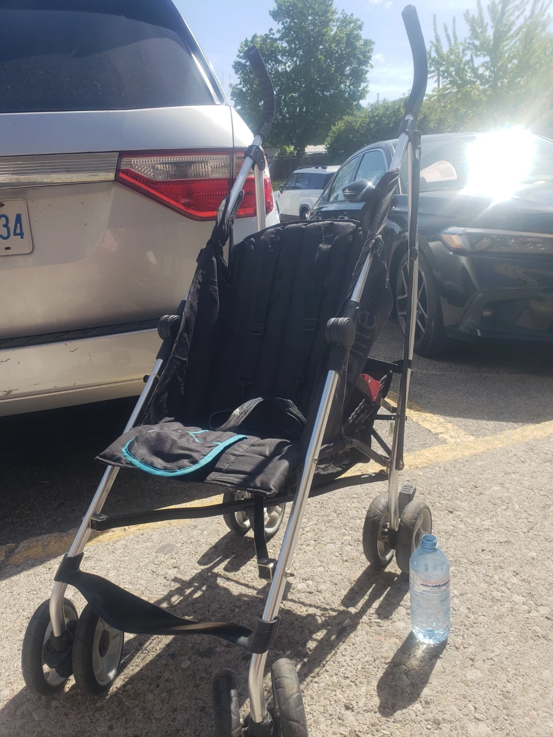 Compact, foldable stroller. Black fabric, silver frame. Features small storage basket. Good for travel.
