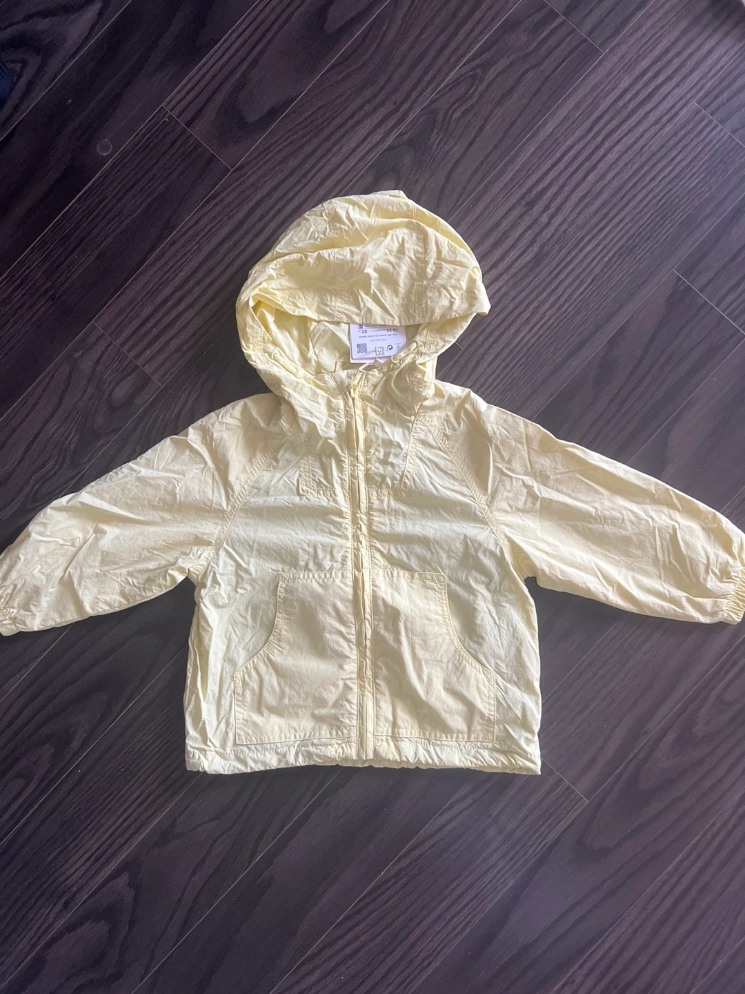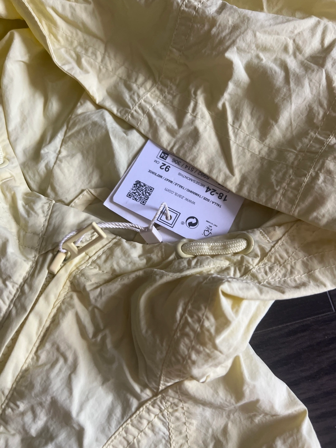 Pale yellow hooded jacket. Lightweight fabric. Zip closure. Front pockets. Size 92.