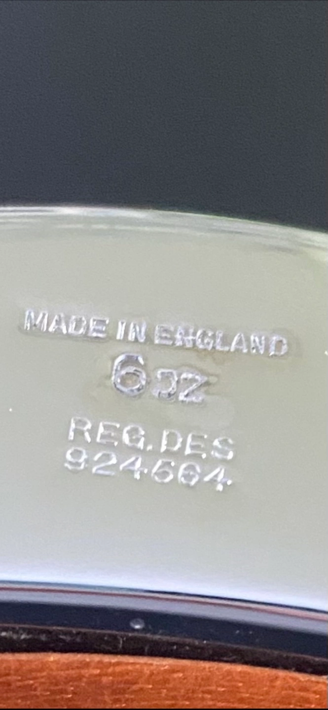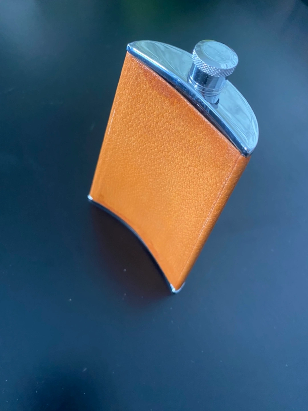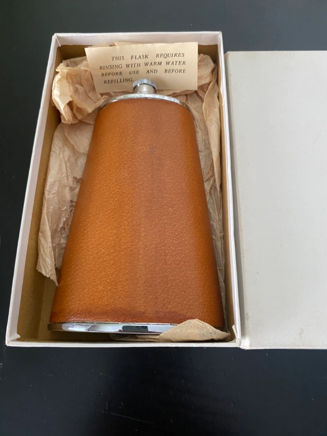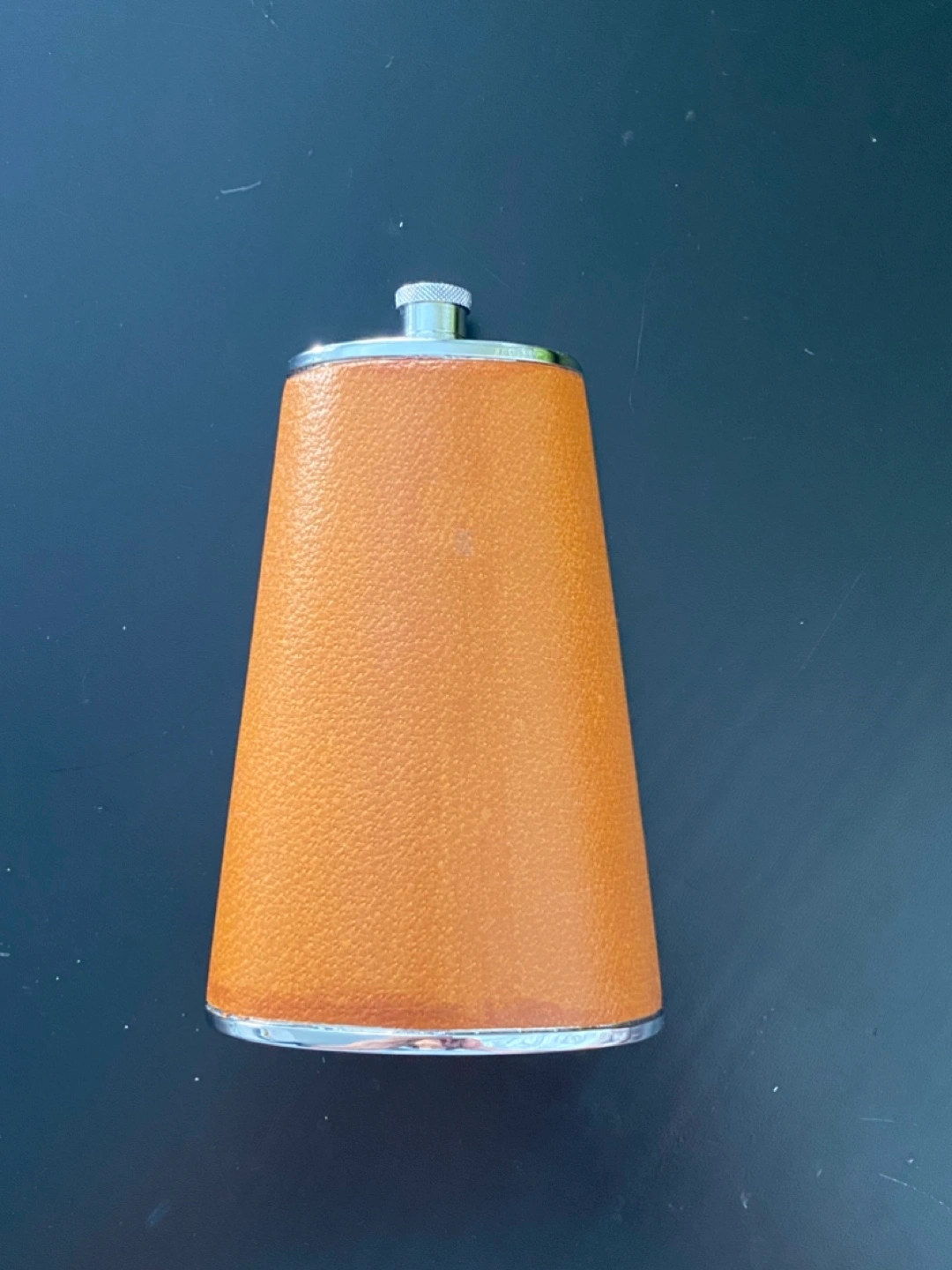 Vintage brown leather-covered hip spirit flask. Stainless steel, 6 Fl. oz. Made in England. Wide body, narrow neck. Screw top. Cash and pick up only. Cawthra and Lakeshore area in Mississauga.