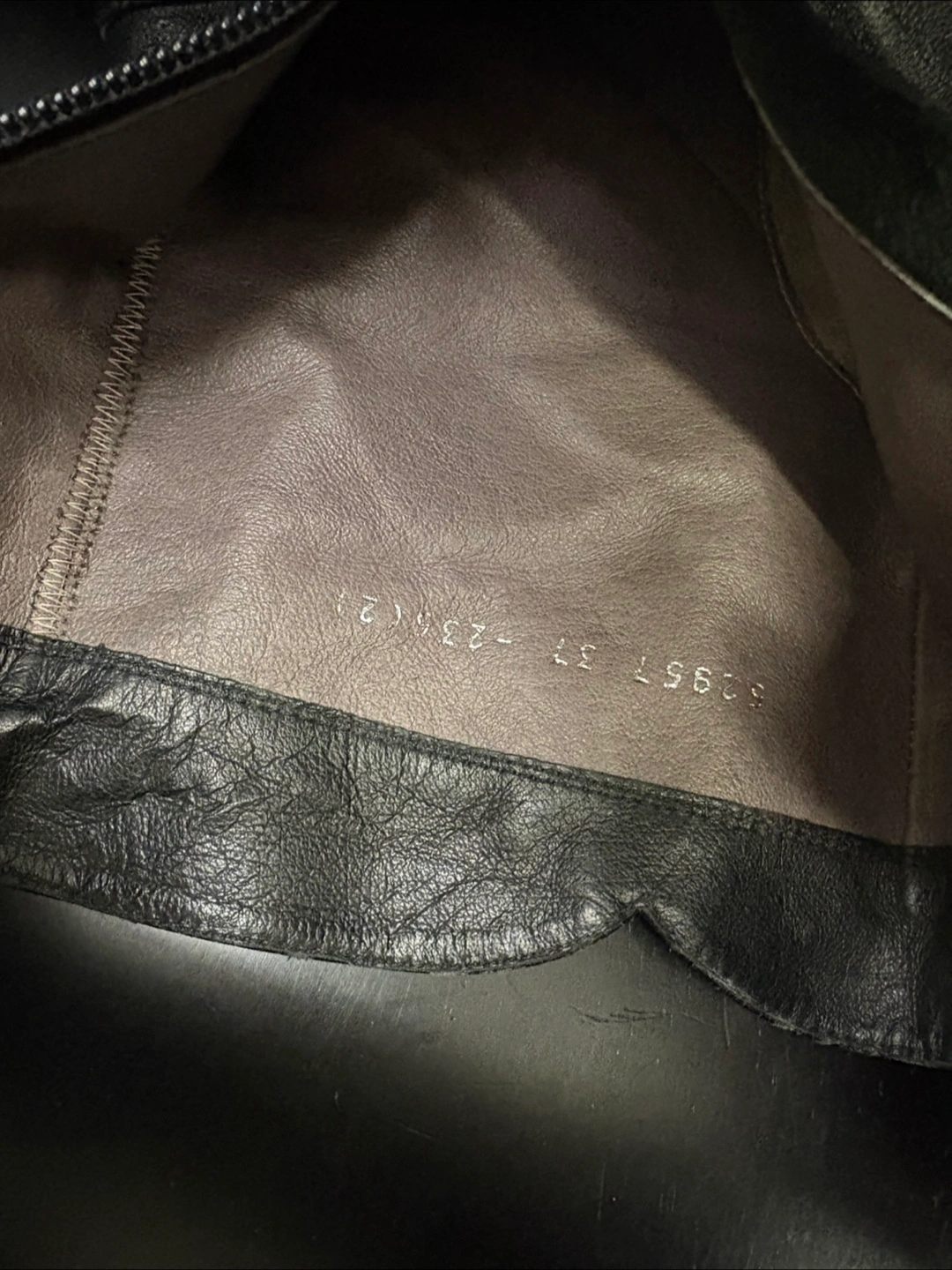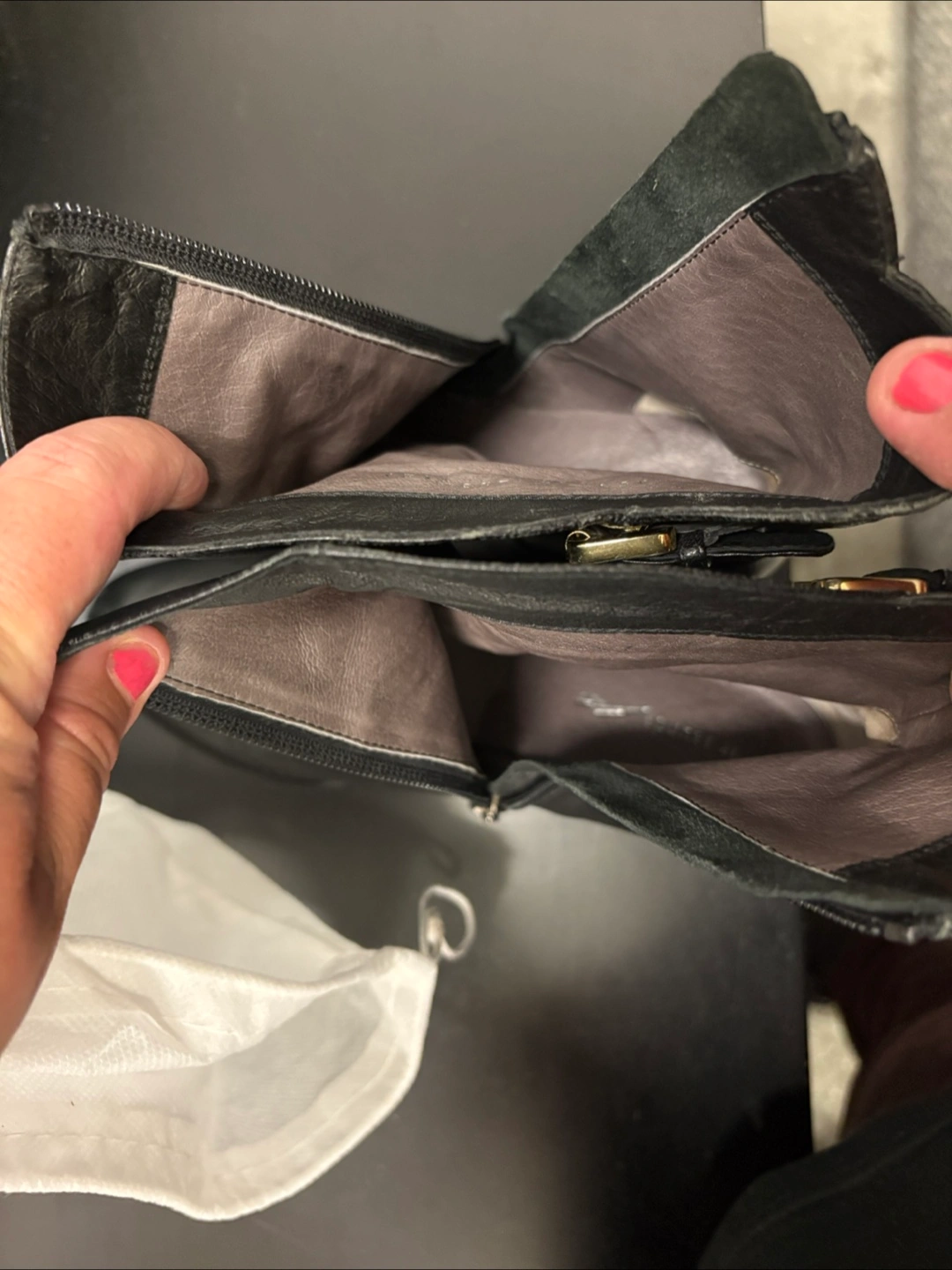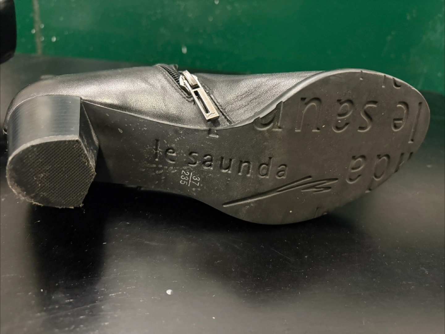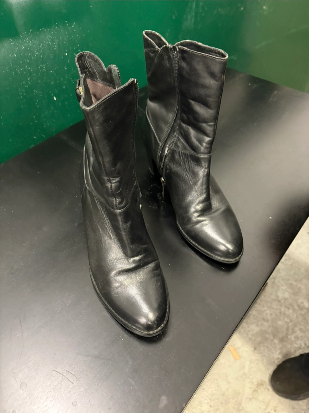 Women's black leather ankle boots. Features a side zip and buckle detail. Block heel. Pre-owned.