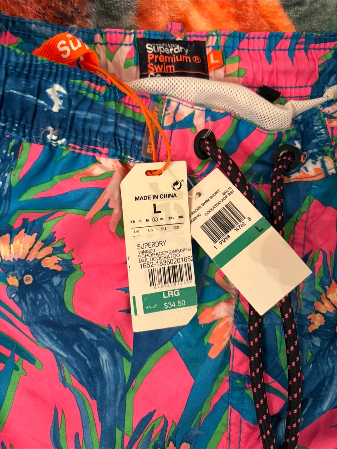 Men's large swim trunks. Floral and bird print. Features a mesh lining and drawstring closure. Bright pink, teal, and orange colours.