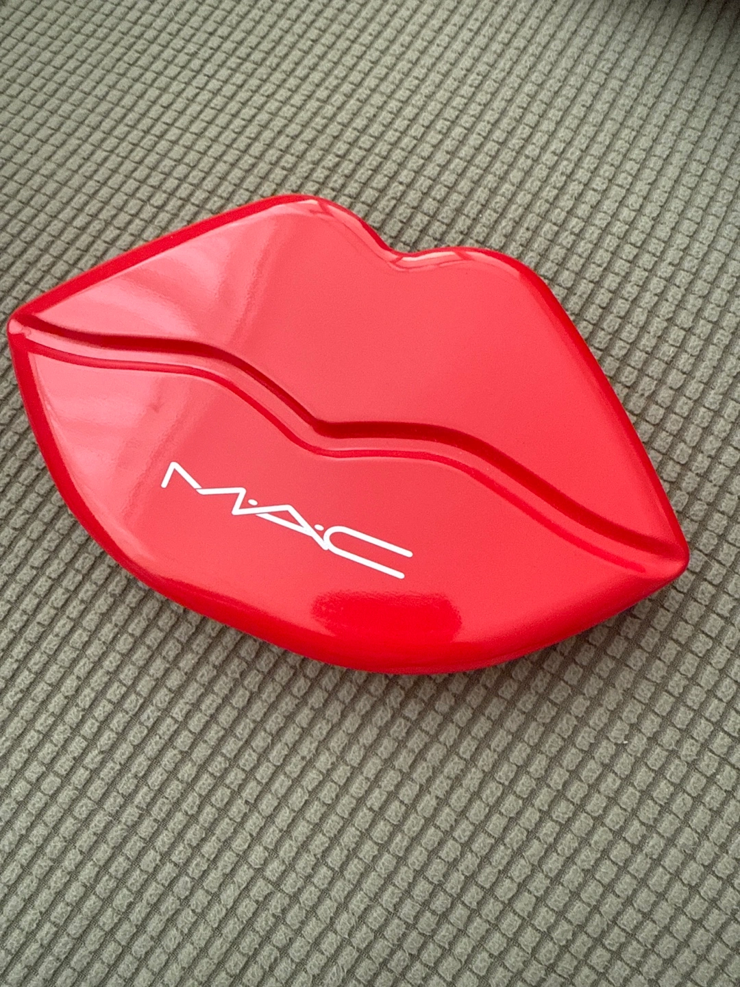 Red tin in the shape of lips. Great for storing makeup or other small items. Brand logo visible on the outside.