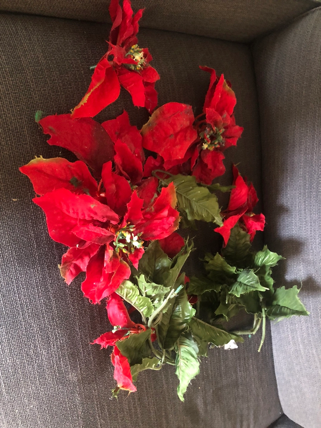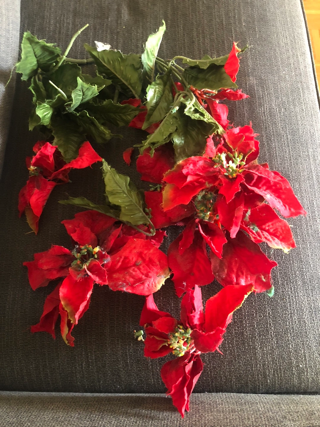 Assortment of artificial poinsettia flowers and greenery. Perfect for holiday crafting or decorating. Some wear and tear. They are washed and clean.