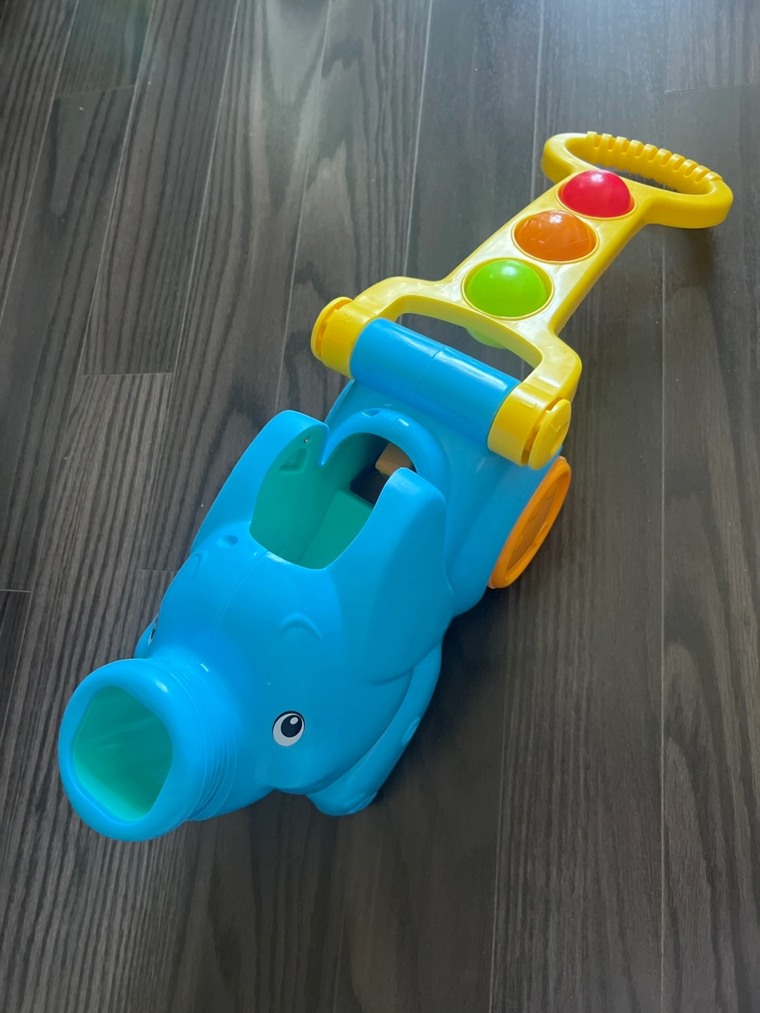 Cute blue elephant-shaped push and pull walker. Features colourful balls on the handle. Great for toddlers learning to walk. Wheels for easy movement.